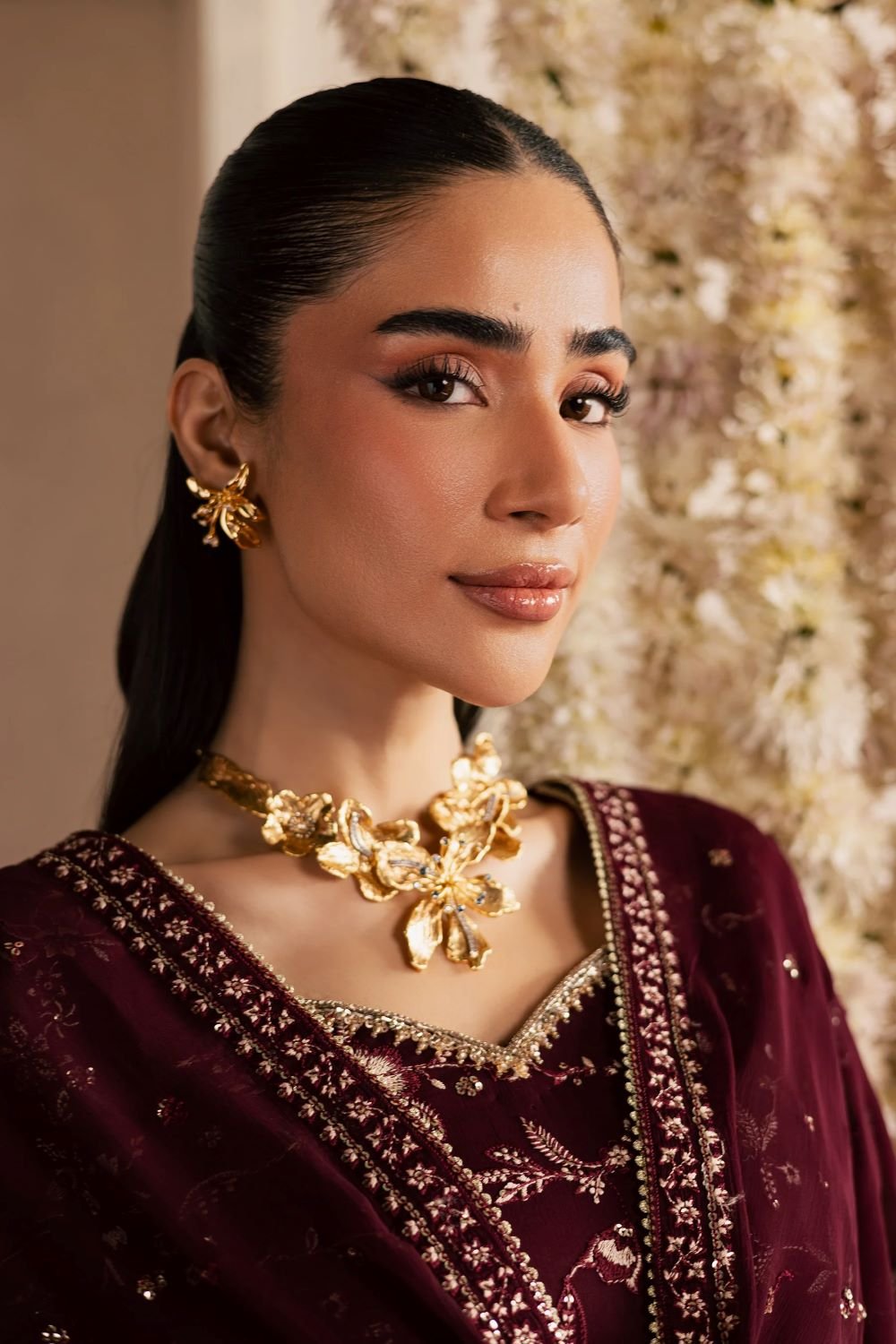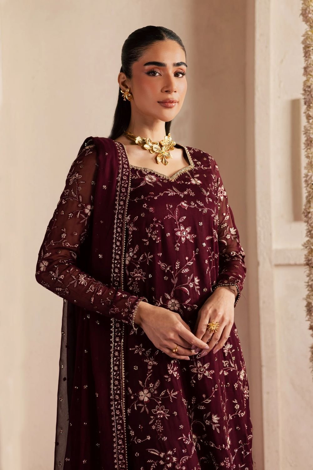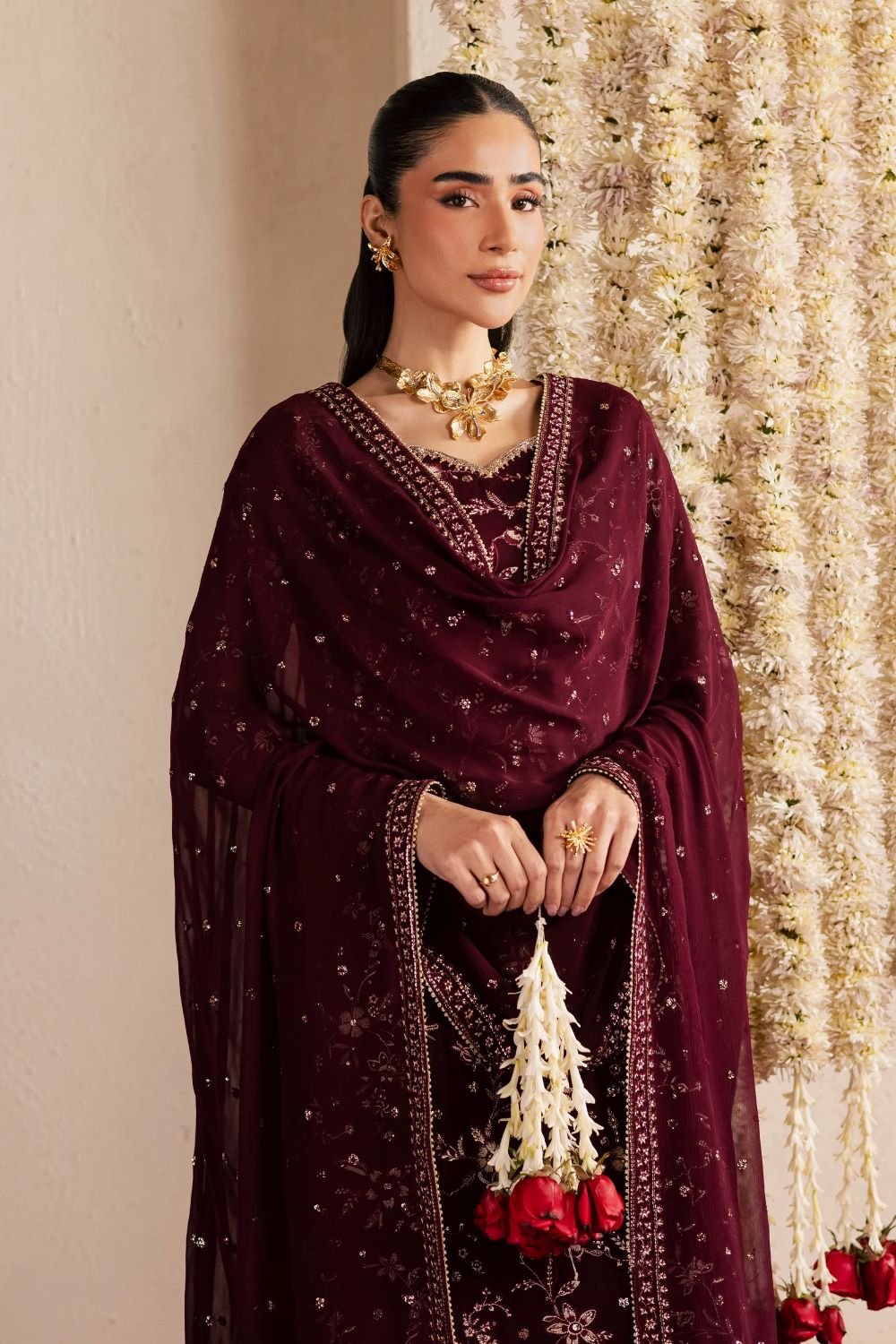 An embroidered crinkle dupatta completes the look, introducing movement and softness while maintaining the luxurious appeal of this Eid ensemble.