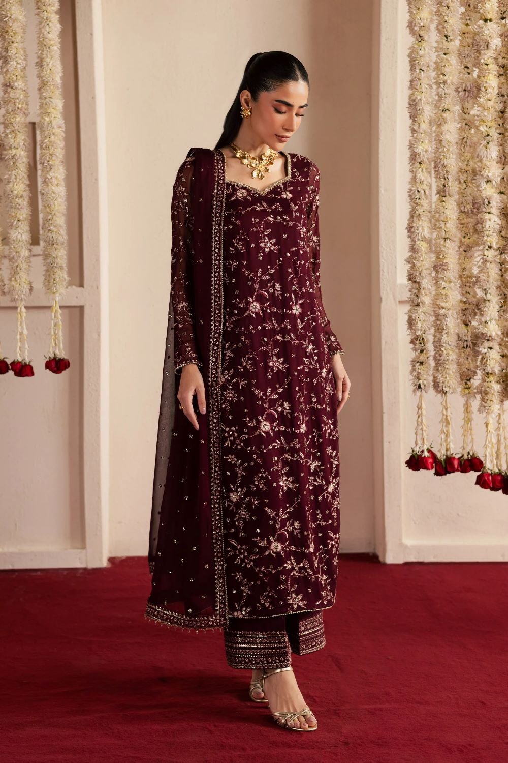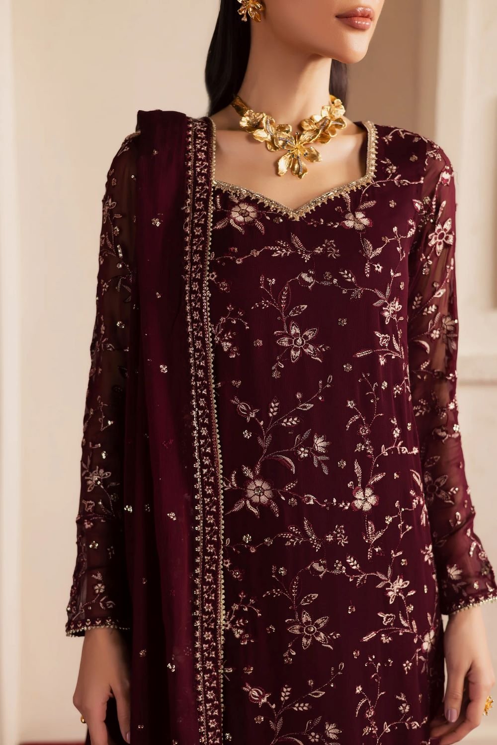This three-piece Eid outfit features a long maroon crinkle shirt with sleeves adorned in a fully composed embroidered jaal across the front and sleeves. The adda-work neckline enhances the intricate detailing, creating a striking and refined festive look.