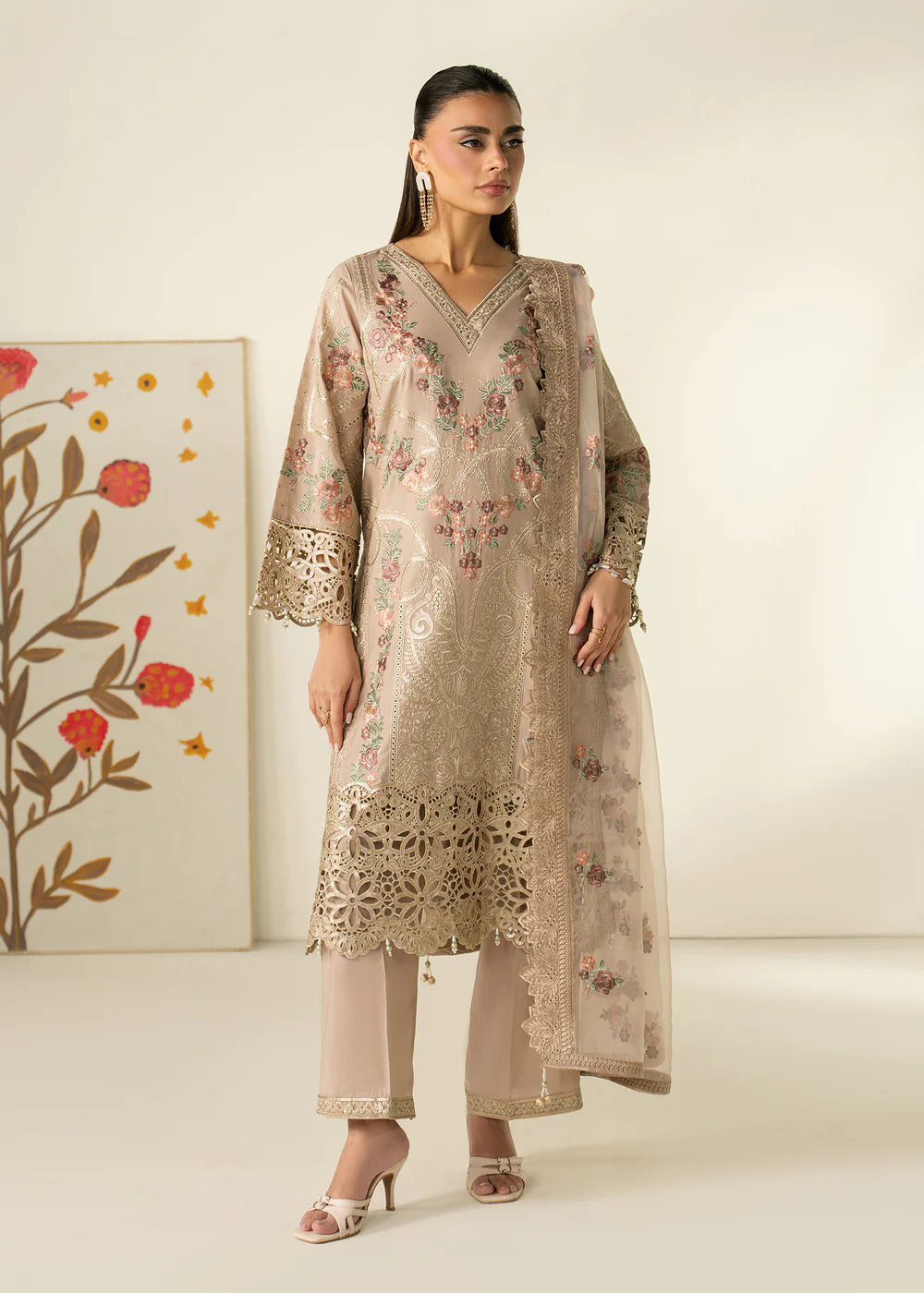 Beige Lawn 3 Piece Festive Straight Kurta Suit Set