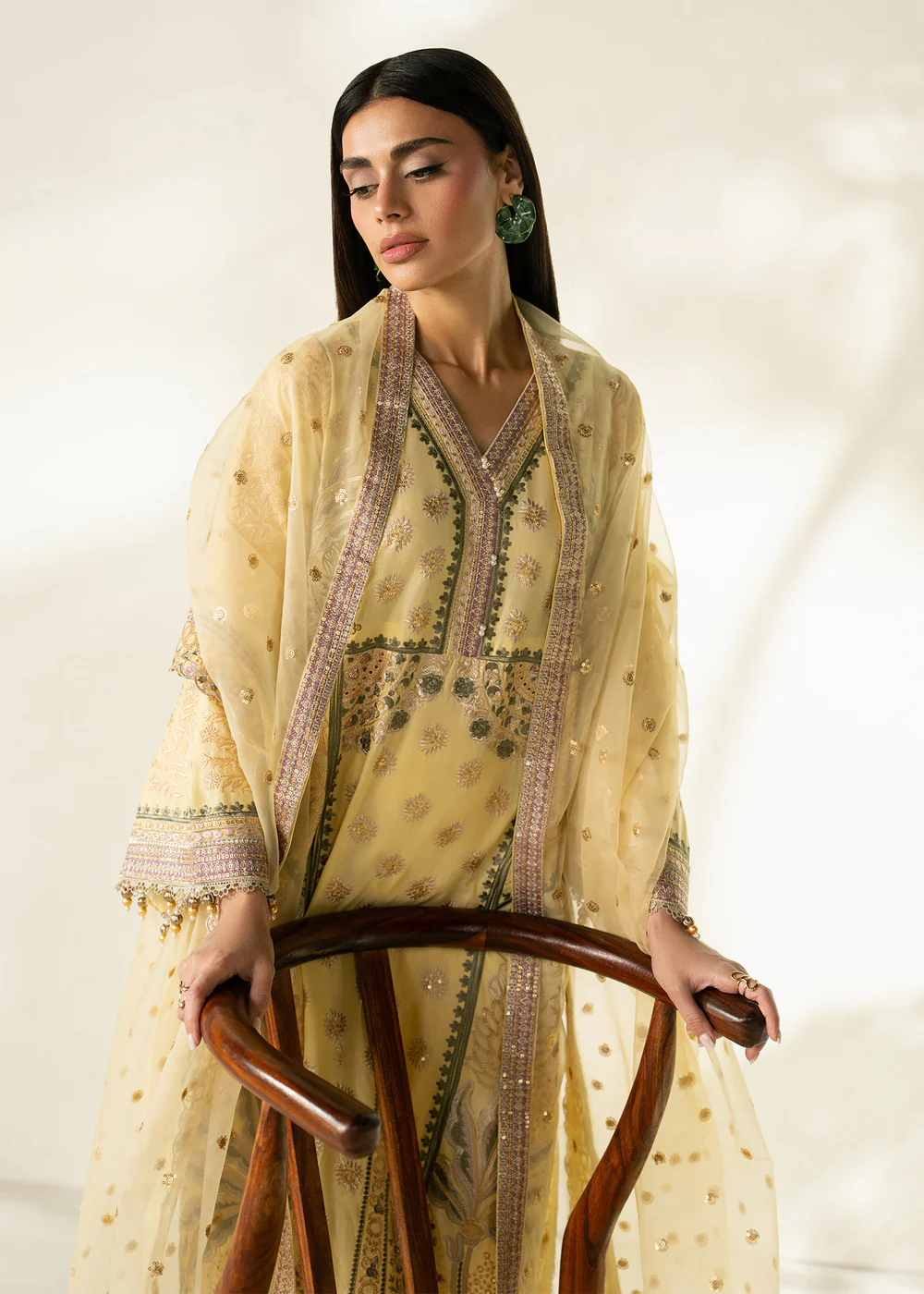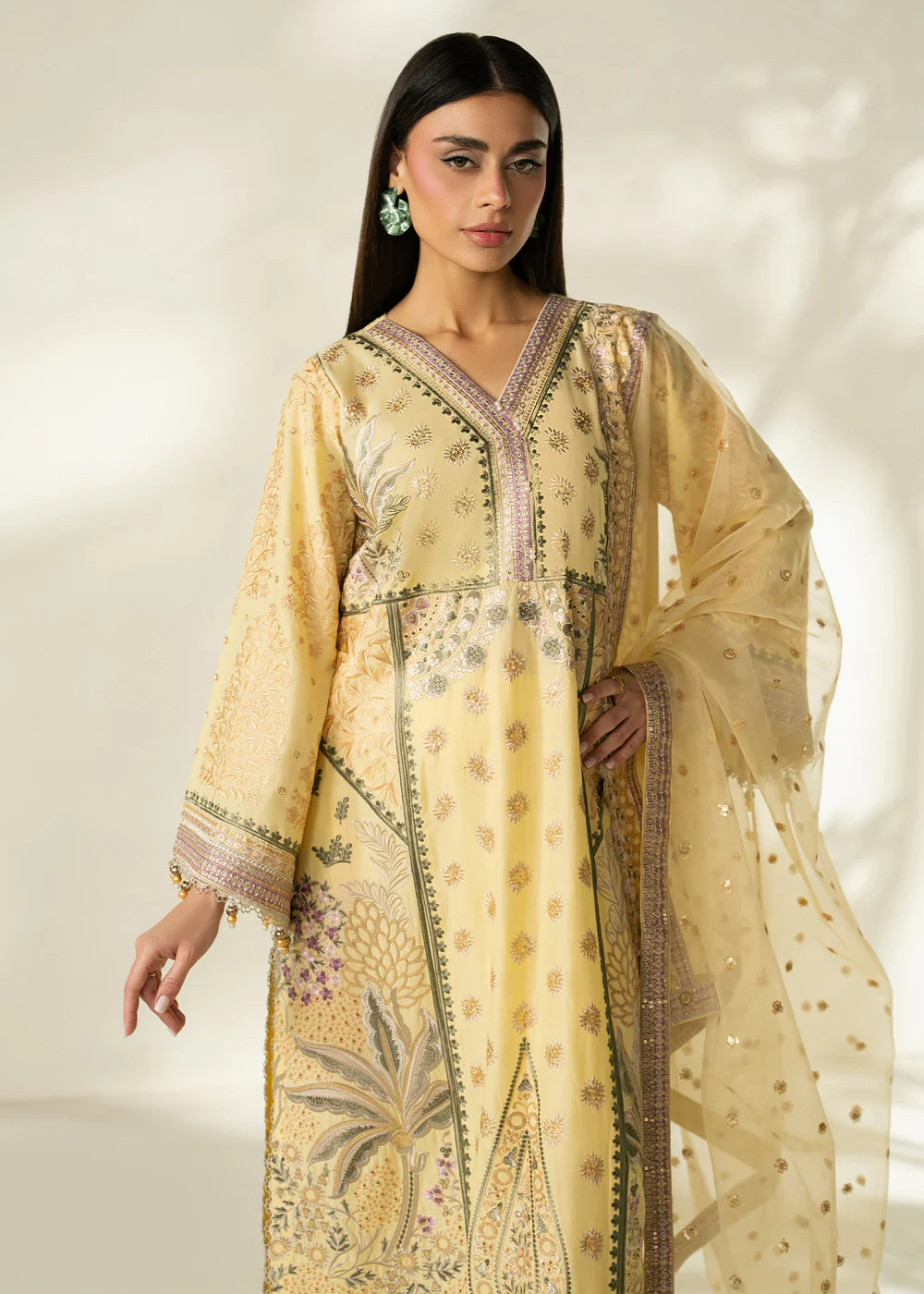 A soft butter-yellow 3 piece lawn suit featuring a straight cut kurta with delicate motifs and a refined neckline, paired with straight trousers and a sheer embellished dupatta—perfect for summer and festive wear.