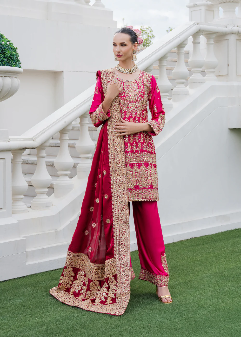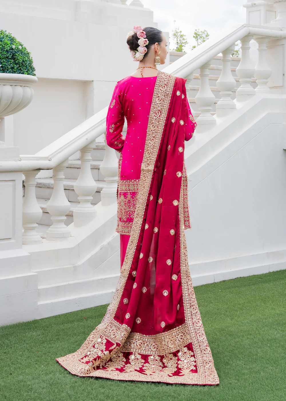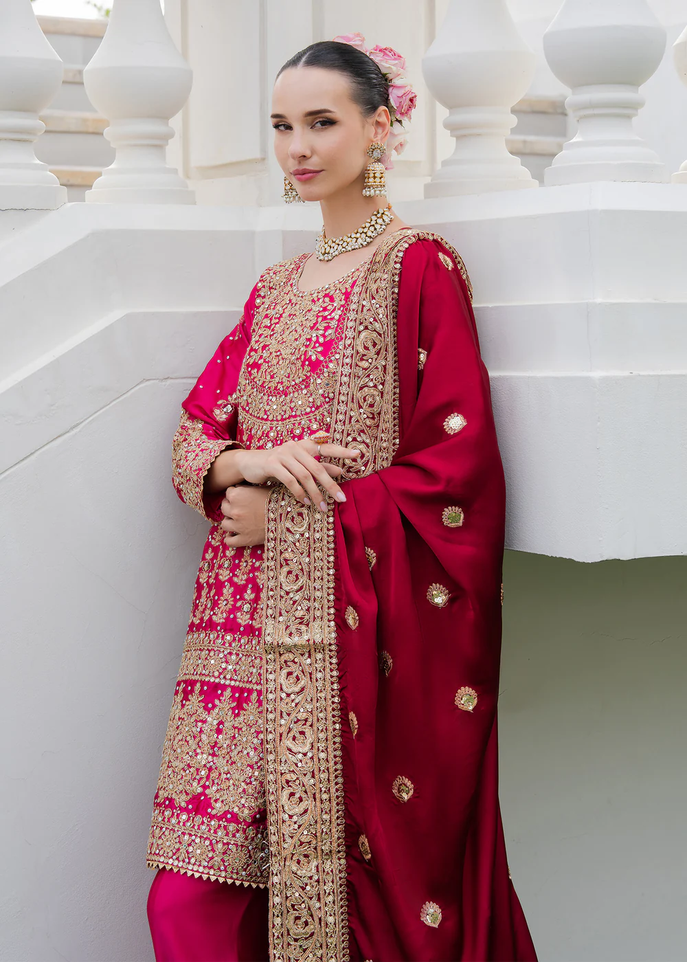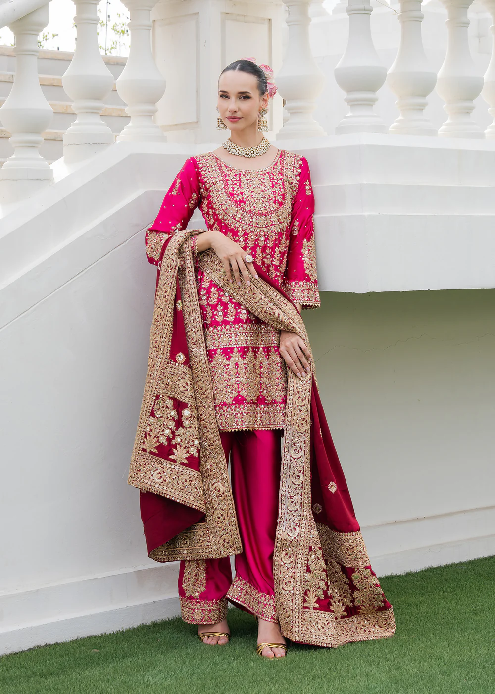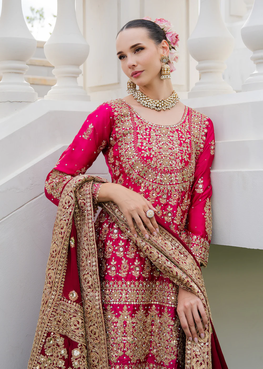 Drenched in a rich fuchsia hue, this outfit is adorned with intricate gold embroidery that reflects true festive grandeur. The smooth, glossy charmuse (shamooz) fabric enhances the overall appeal with its soft texture and elegant fall. The heavily embellished dupatta with statement borders adds a regal touch, making it perfect for weddings, Eid, and special celebrations.