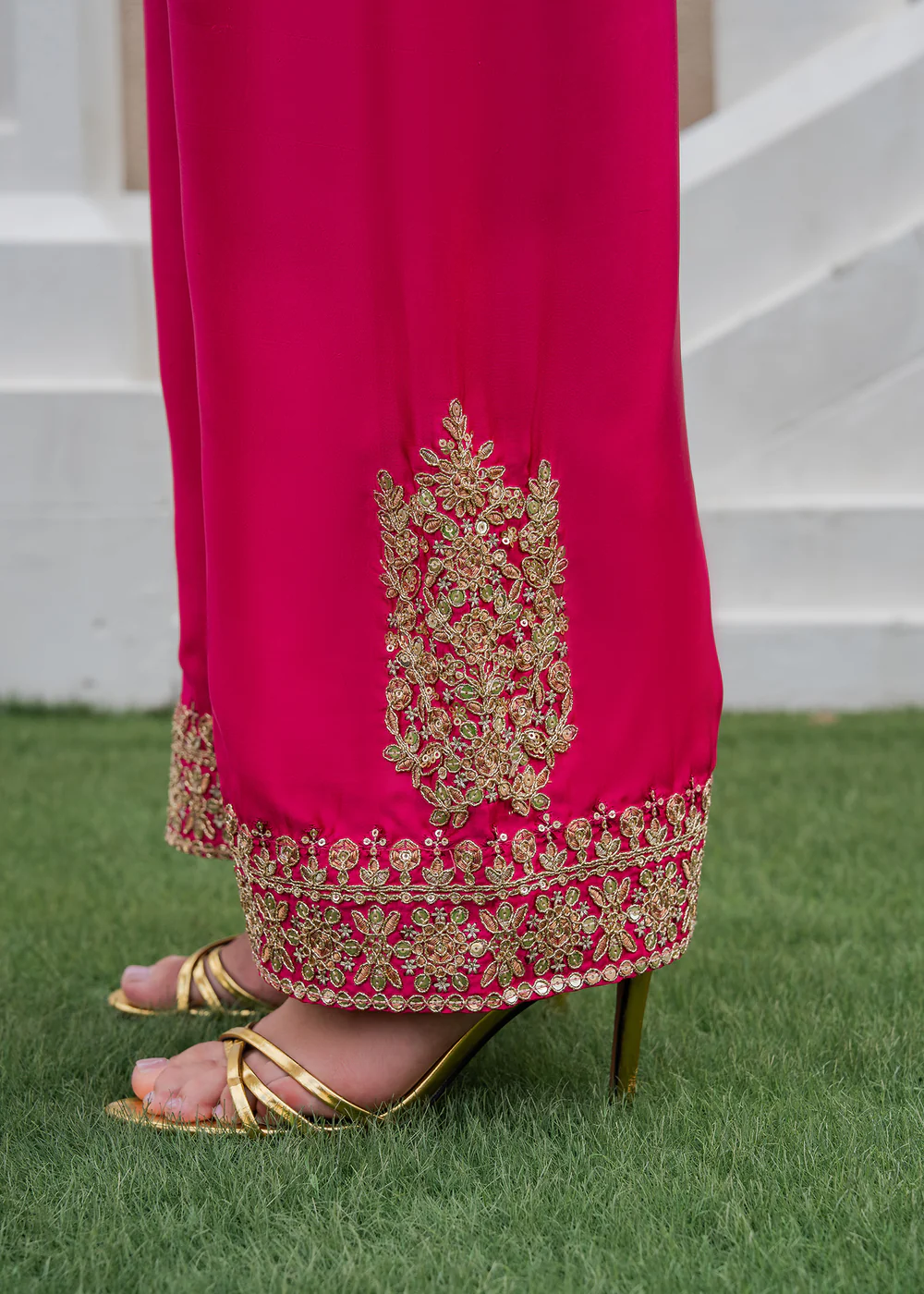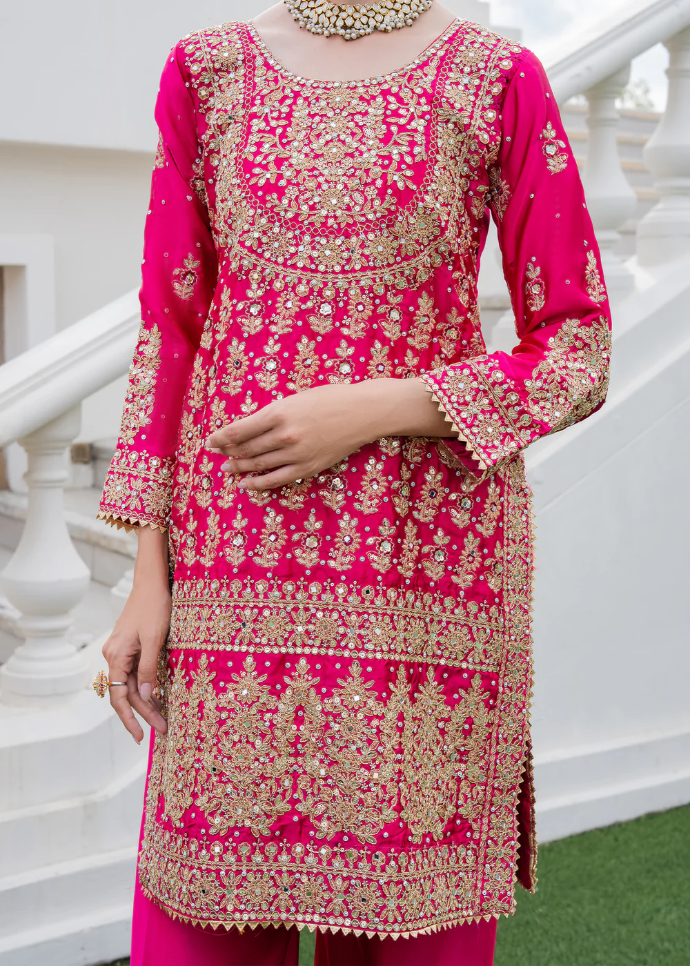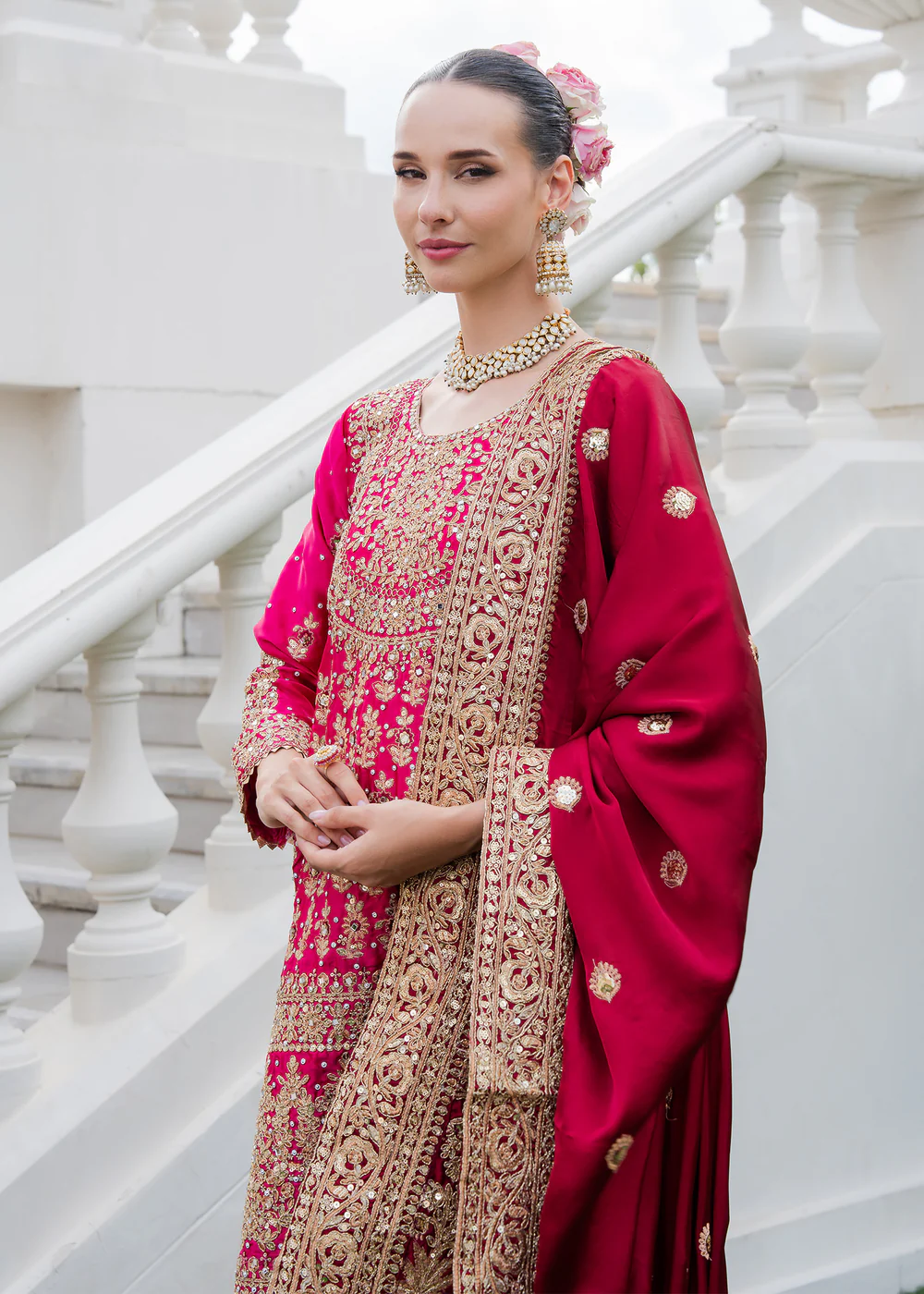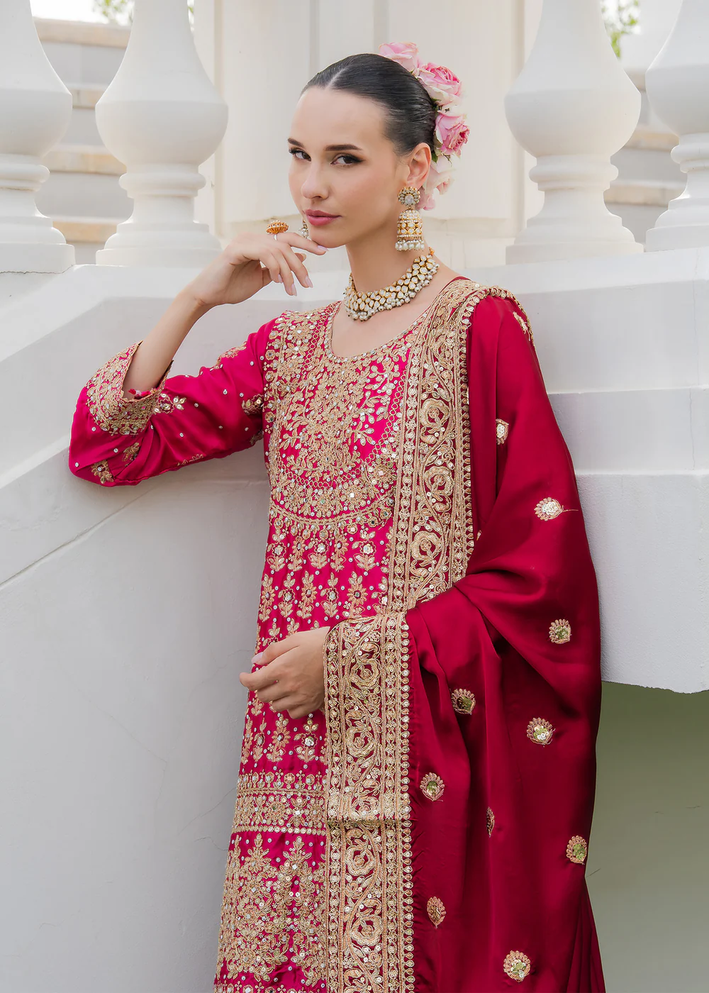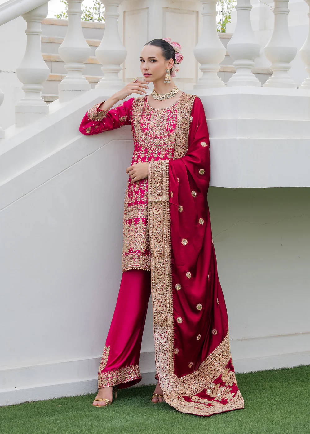 Drenched in a rich fuchsia hue, this outfit is adorned with intricate gold embroidery that reflects true festive grandeur. The smooth, glossy charmuse (shamooz) fabric enhances the overall appeal with its soft texture and elegant fall. The heavily embellished dupatta with statement borders adds a regal touch, making it perfect for weddings, Eid, and special celebrations.