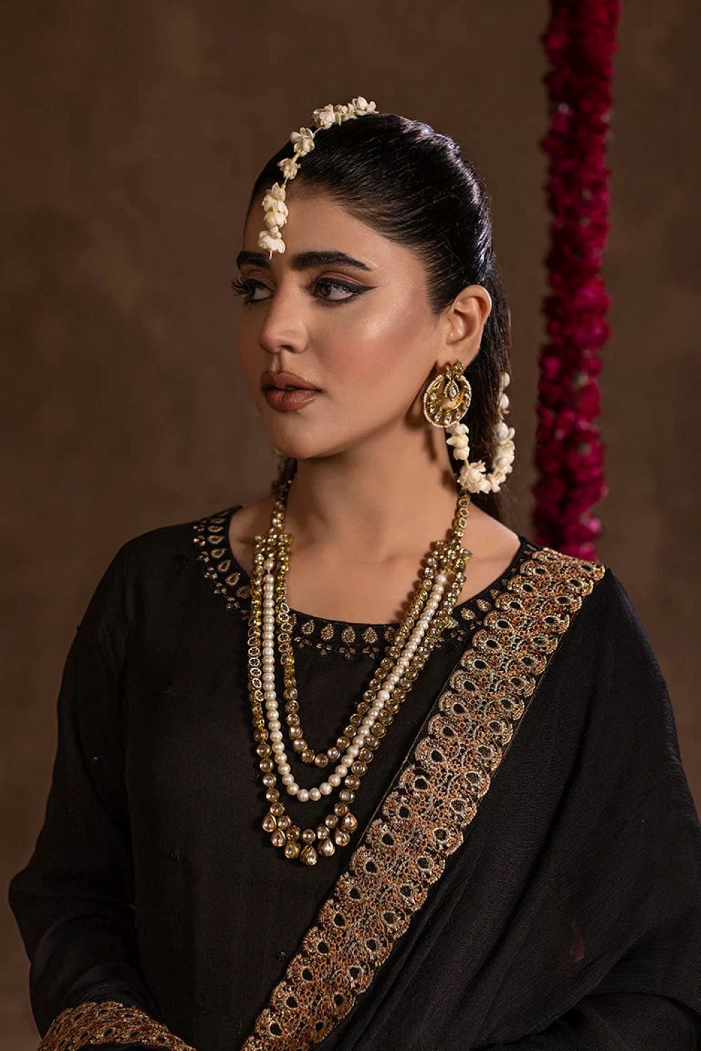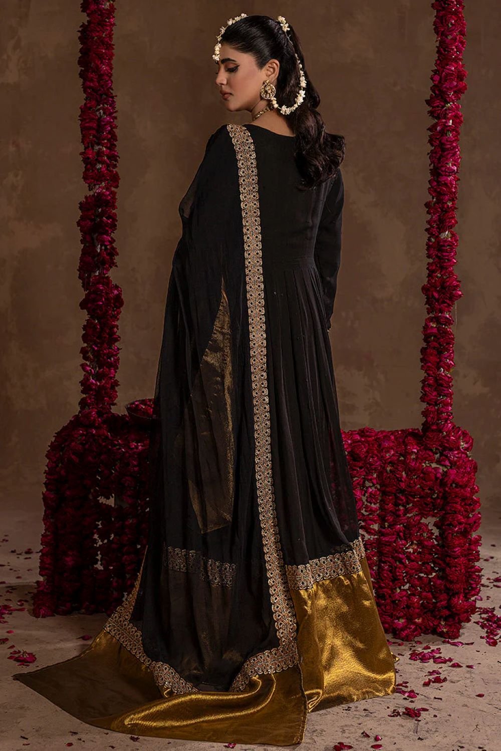 Reveal nighttime magnificence in this stunning readymade black chiffon maxi, a combination of opulence for timeless occasions. The fully lined dress falls beautifully and contains detailed embroidery around the neckline, sleeve, and hem with lavish gold borders that shine bright like hidden treasure. A matching chiffon dupatta with light and airy flow is complimented by intricate light lace, while grip silk trousers mixed with the finest quality give ease and elegance. Ready-to-wear luxury, this ensemble expertly adds a touch of understated elegance that will change formal festivals into your own royal occasion.