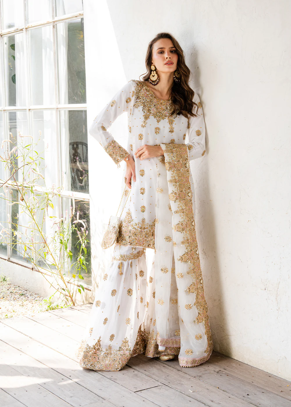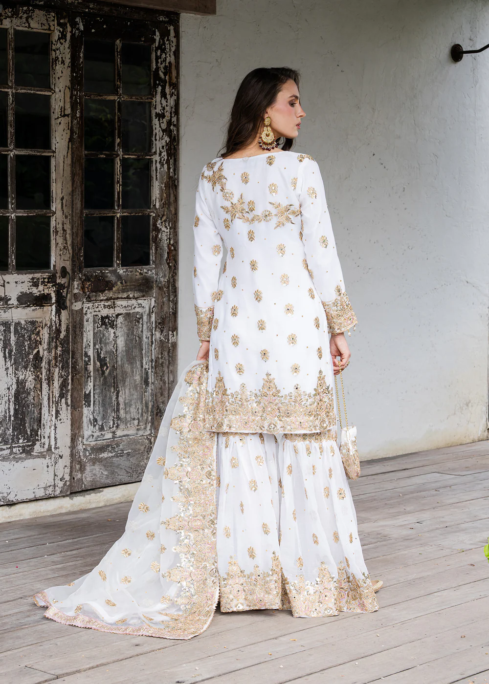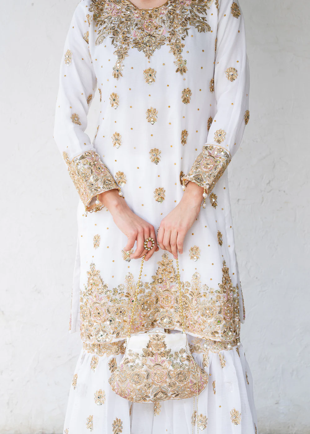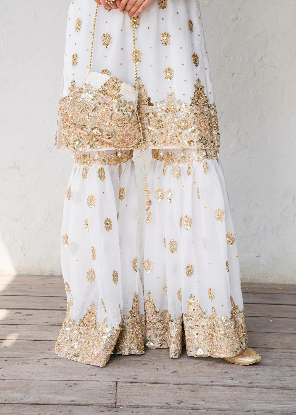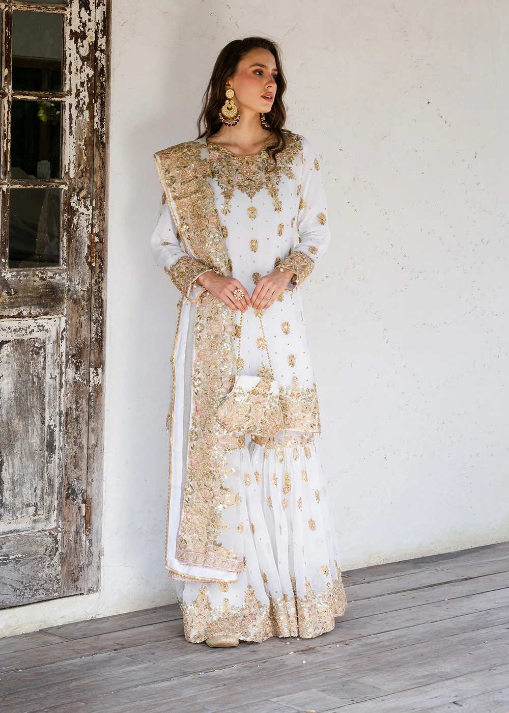 Crafted on a pure ivory base, this outfit is adorned with glistening gold detailing that adds a touch of understated luxury. The lightweight chiffon fabric ensures a graceful, airy drape, while the finely finished edges enhance its premium appeal. Perfect for weddings, Eid, parties, and all-season celebrations, this ivory gharara suit blends classic charm with contemporary style.