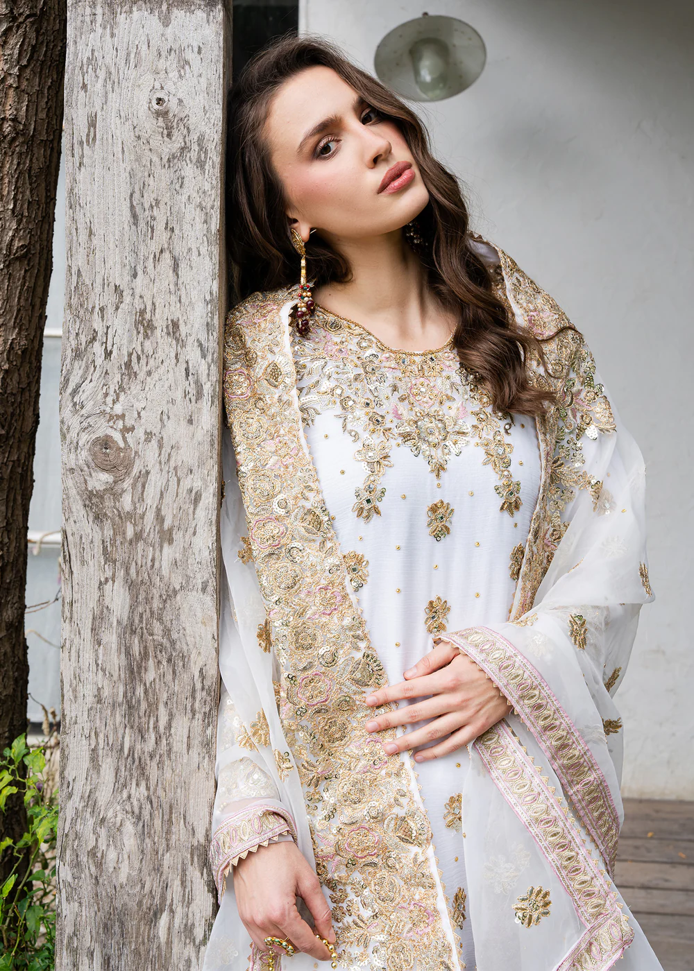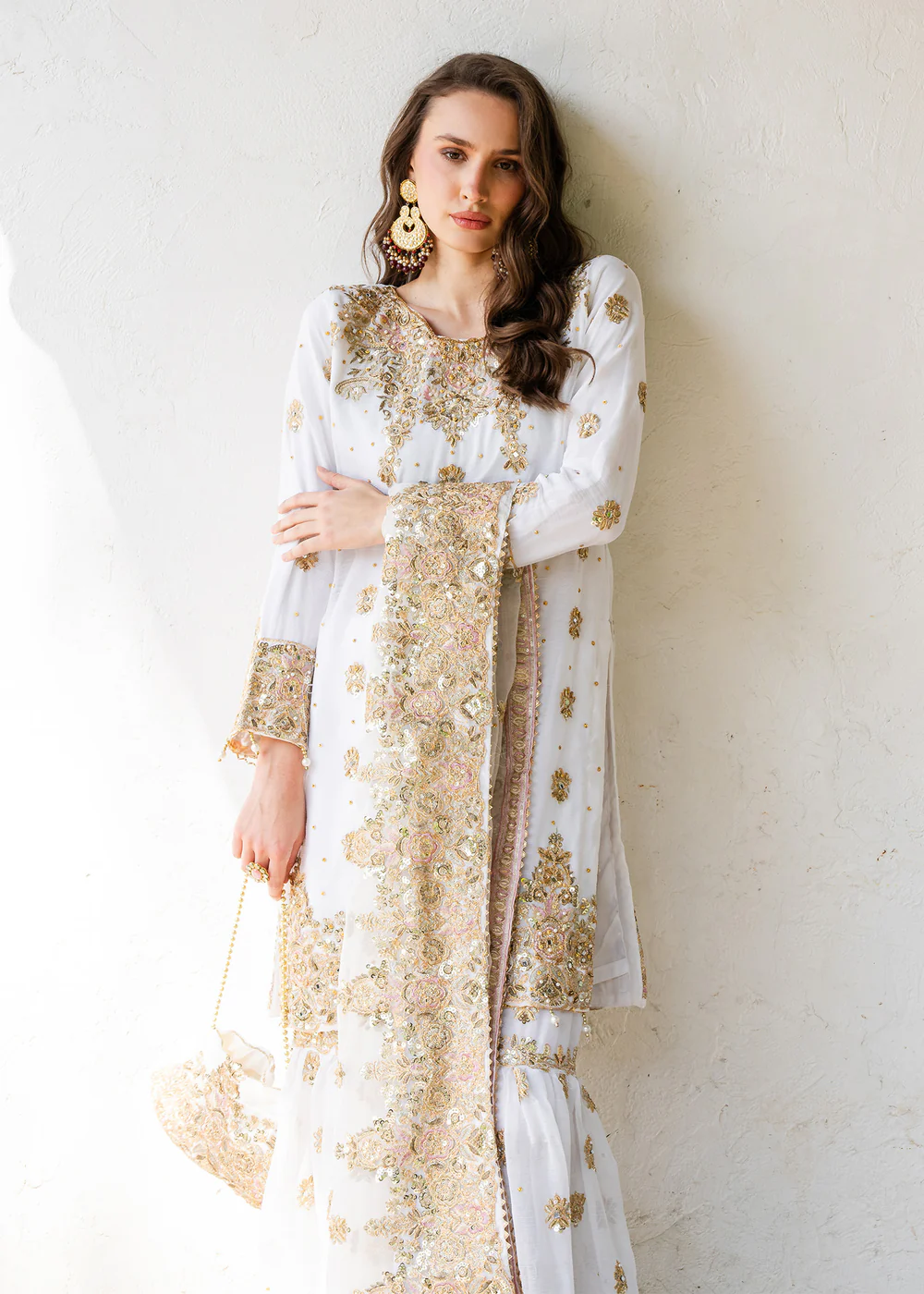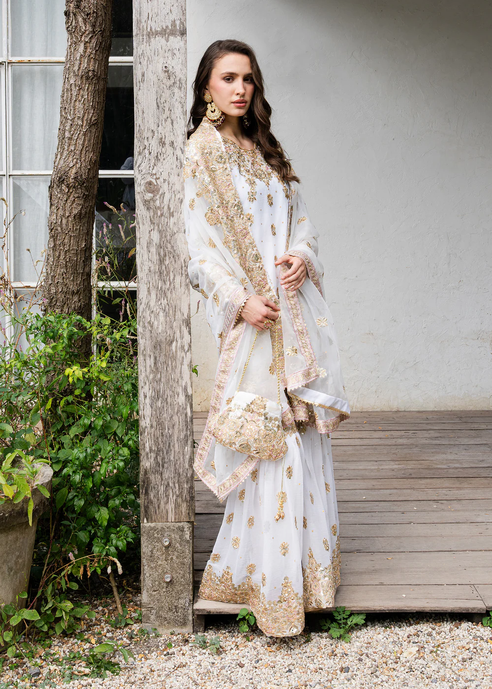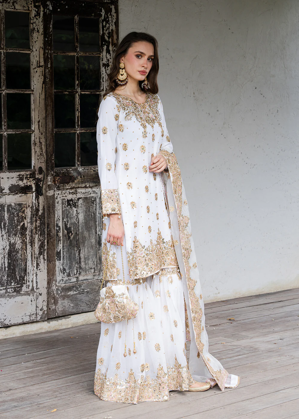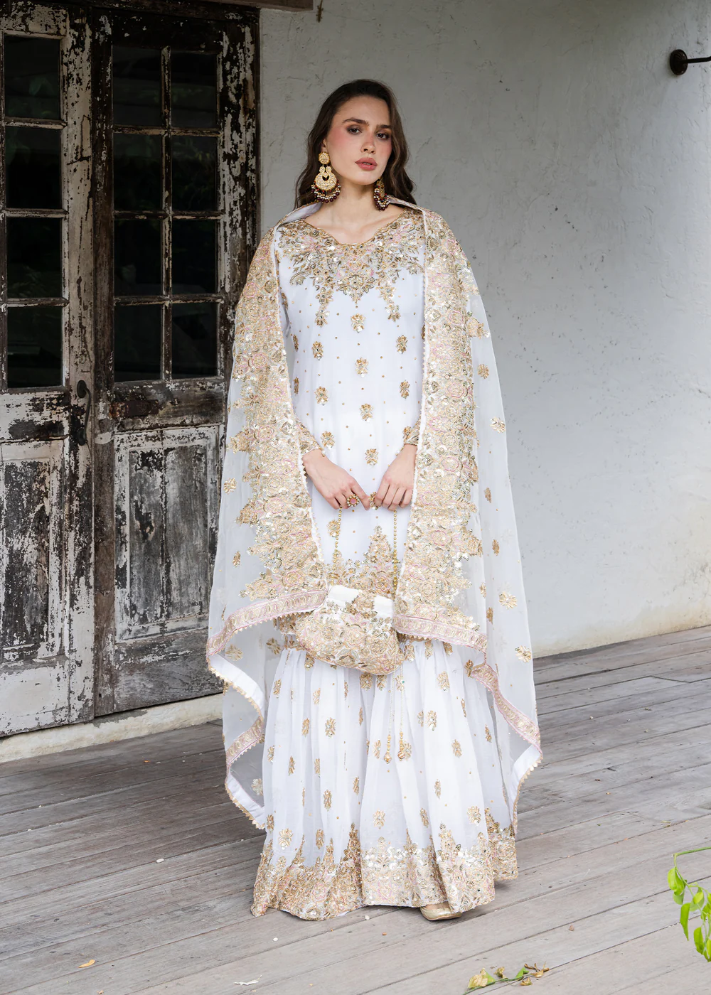 Crafted on a pure ivory base, this outfit is adorned with glistening gold detailing that adds a touch of understated luxury. The lightweight chiffon fabric ensures a graceful, airy drape, while the finely finished edges enhance its premium appeal. Perfect for weddings, Eid, parties, and all-season celebrations, this ivory gharara suit blends classic charm with contemporary style.