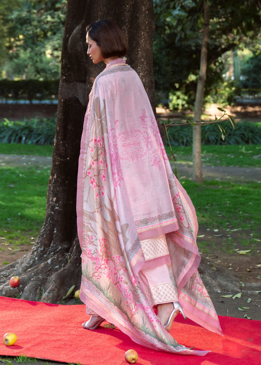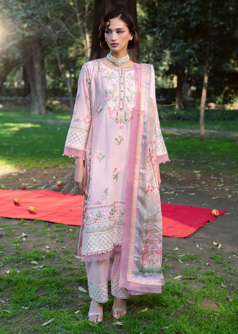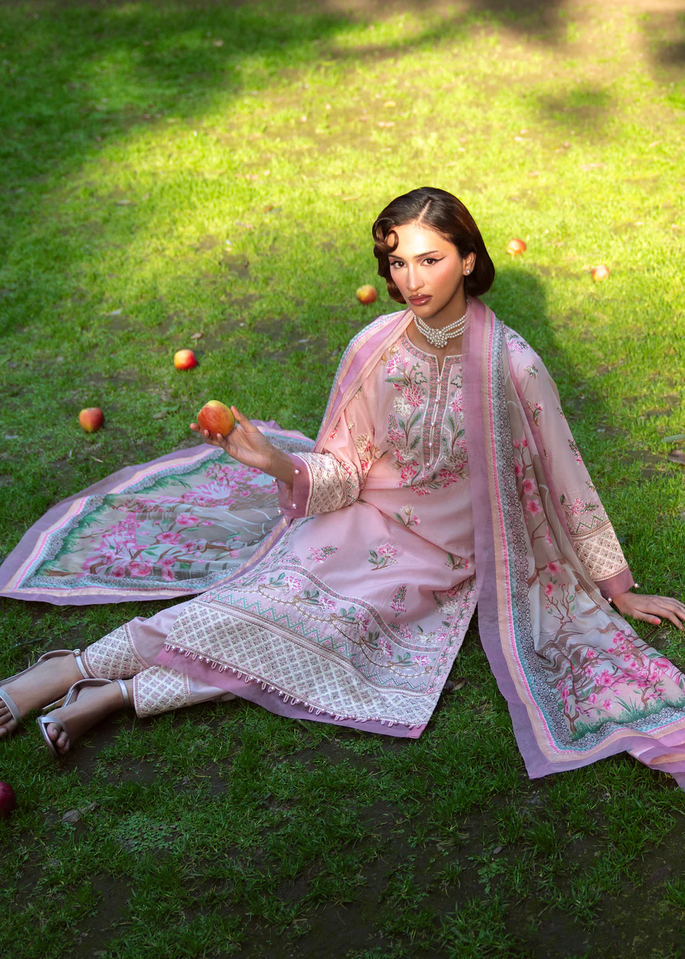 Elegant mauve pink 3-piece lawn suit designed for festive and party wear. Features a straight cut kurta with matching trouser and dupatta, highlighted by striking floral prints over a deep noir-inspired base with refined embroidery detailing.