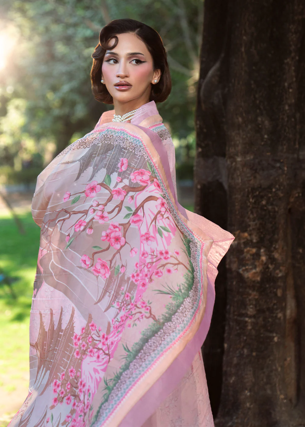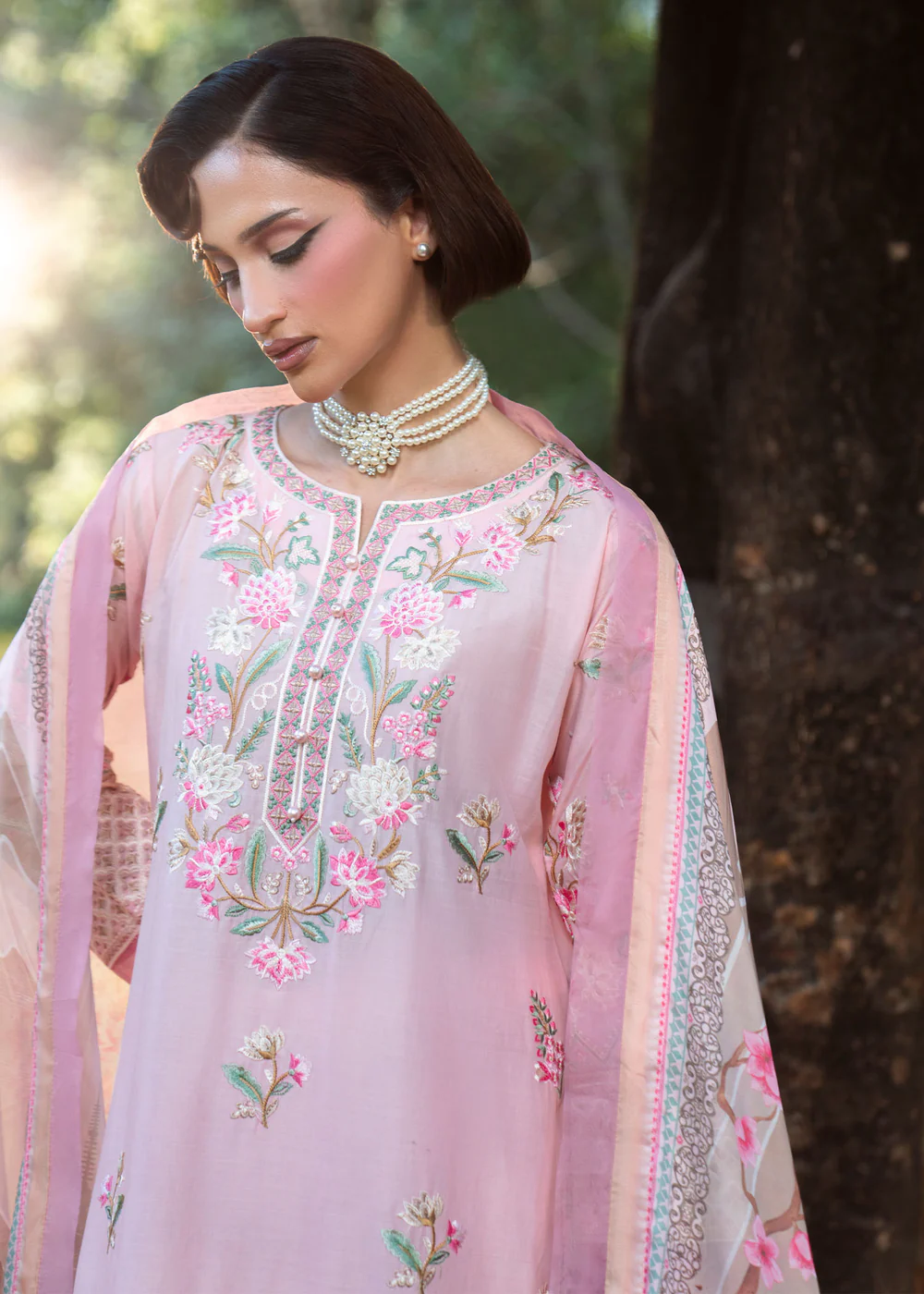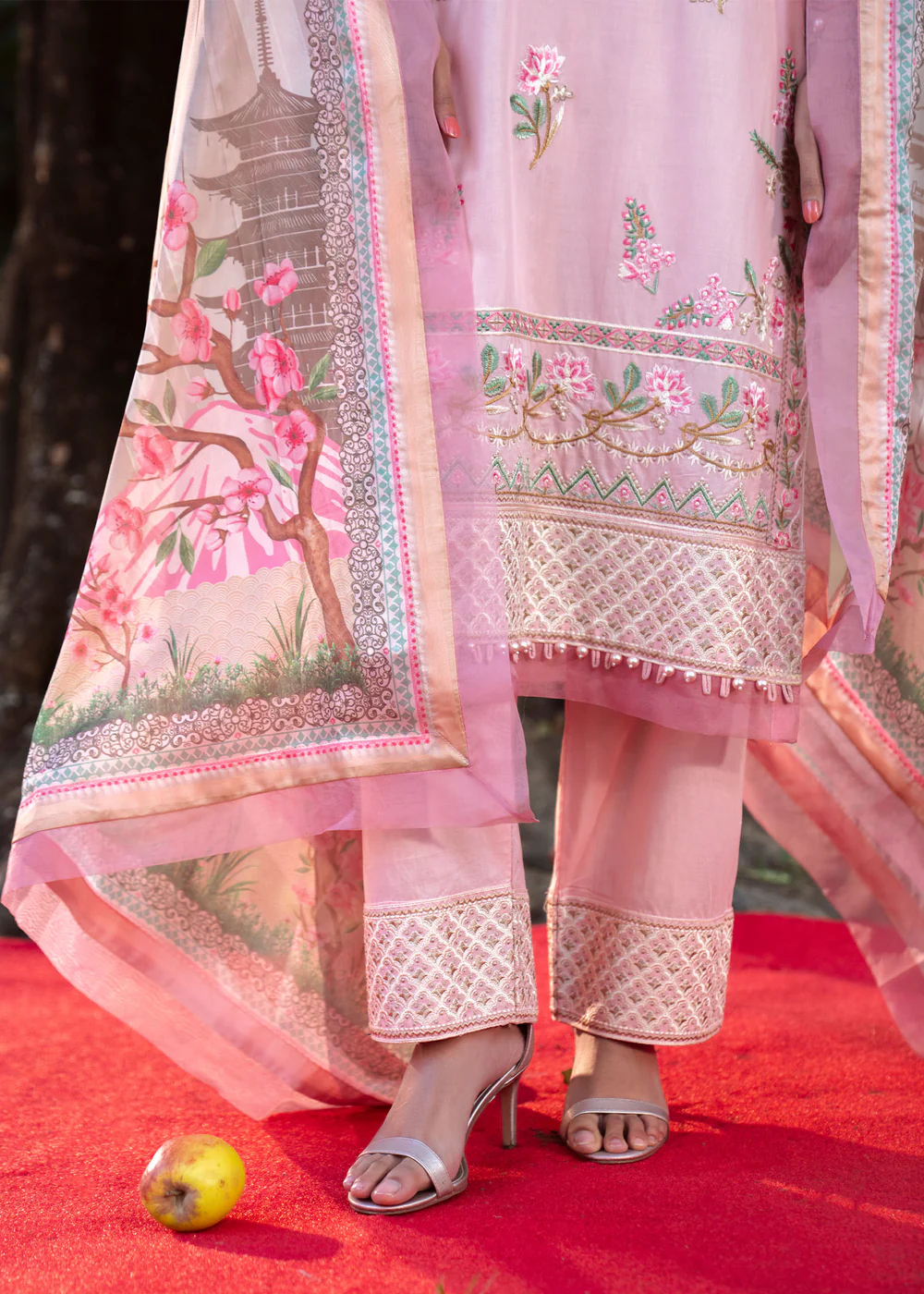 Elegant mauve pink 3-piece lawn suit designed for festive and party wear. Features a straight cut kurta with matching trouser and dupatta, highlighted by striking floral prints over a deep noir-inspired base with refined embroidery detailing.