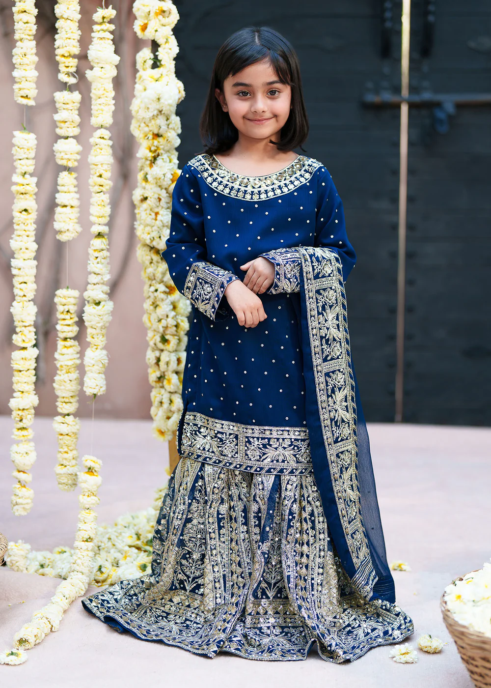 Exude timeless elegance with this luxurious navy blue 3 piece gharara outfit (Product ID: DQM0955), perfect for wedding guest wear and formal occasions. This stunning ensemble features a delicately embellished chiffon shirt, paired with a flared gharara bottom and a beautifully adorned chiffon dupatta, creating a regal and graceful silhouette.