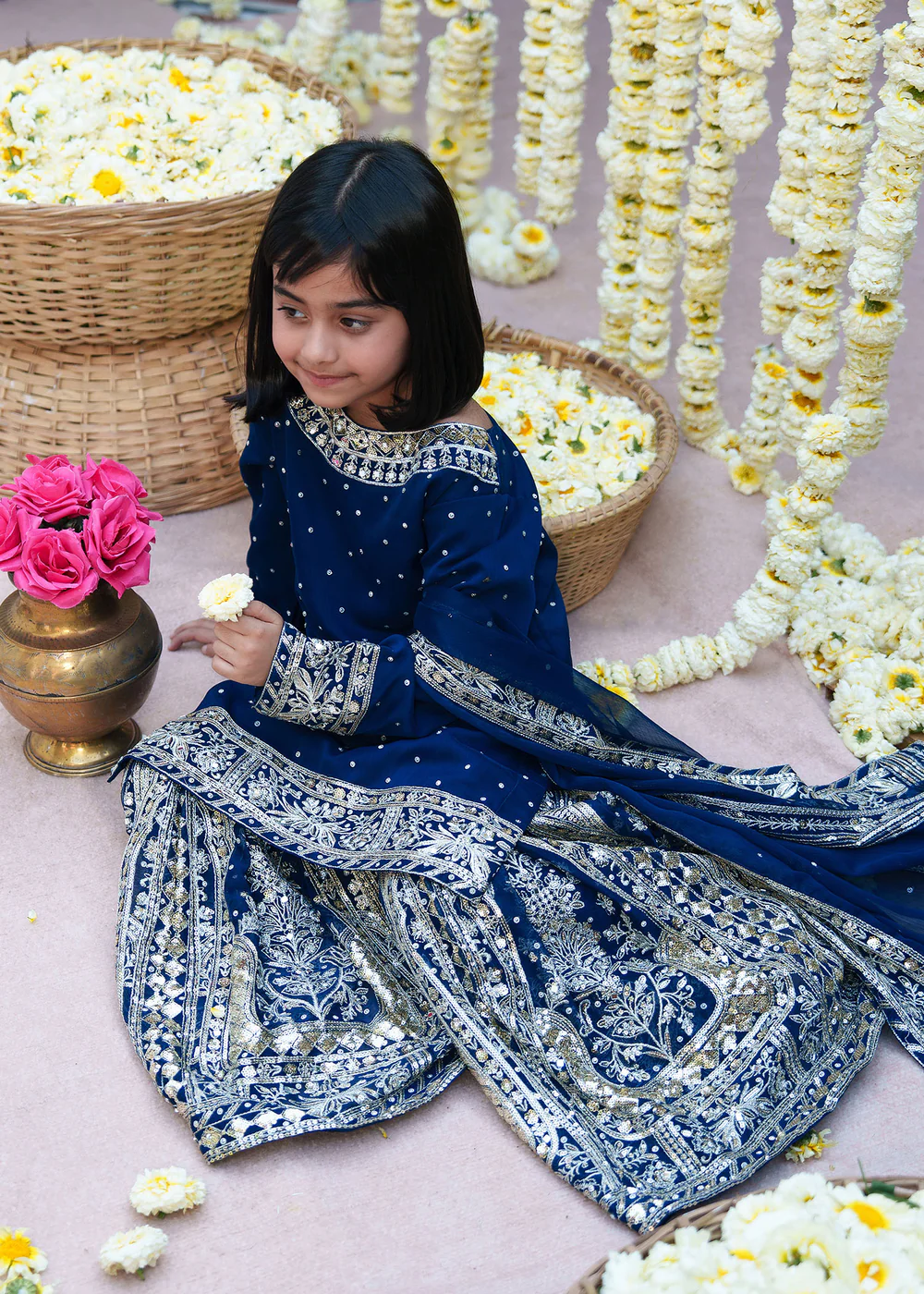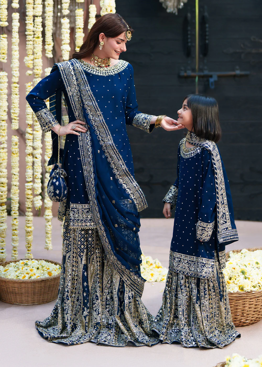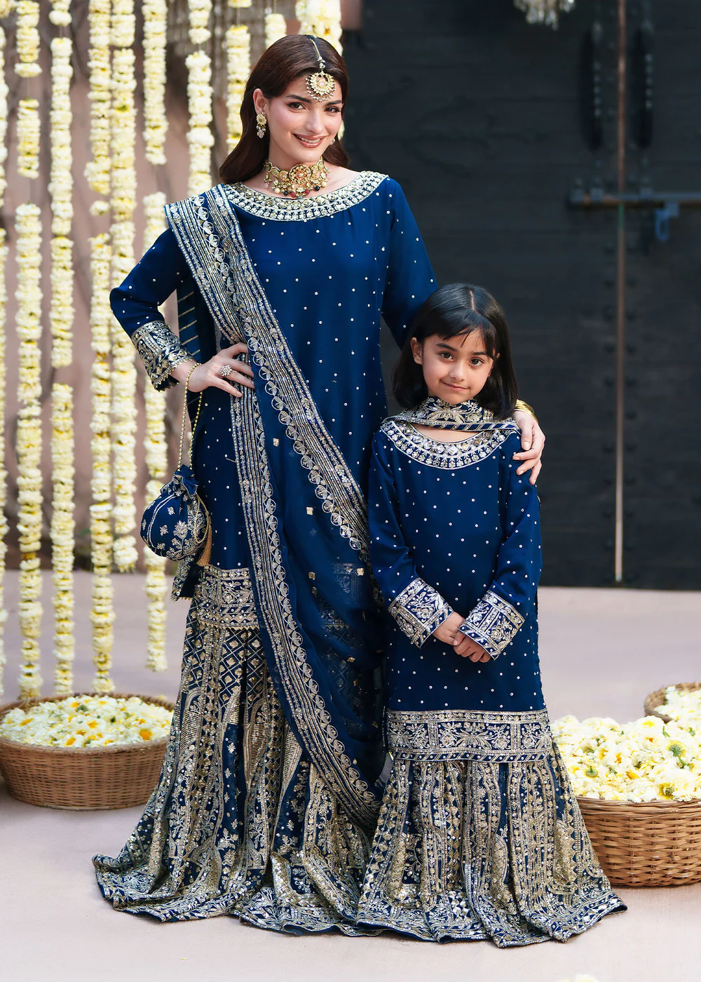 Designed in a rich deep sapphire navy tone, the outfit is enhanced with intricate embellishments that add depth and sophistication. The flowy chiffon fabric ensures comfort while maintaining a lightweight, airy feel, making it suitable for all-season wear. The heavily detailed dupatta completes the look with an elegant and festive touch.