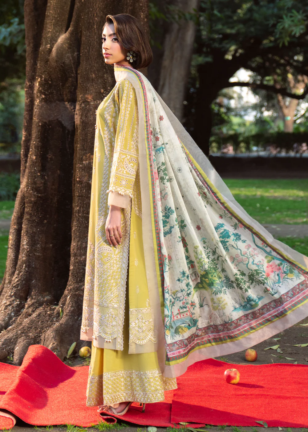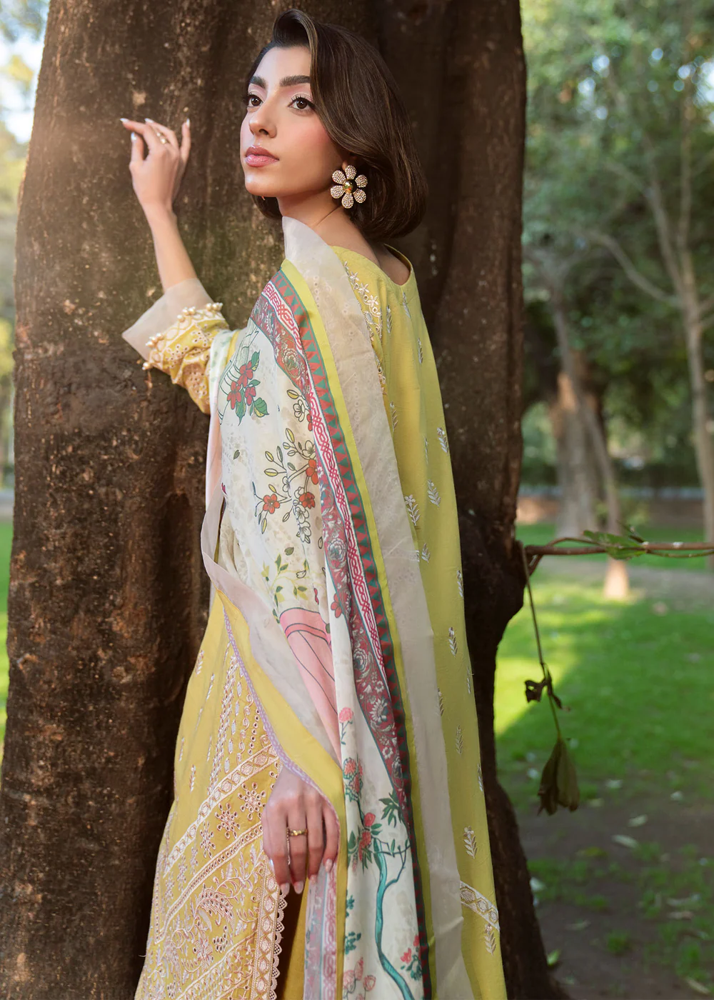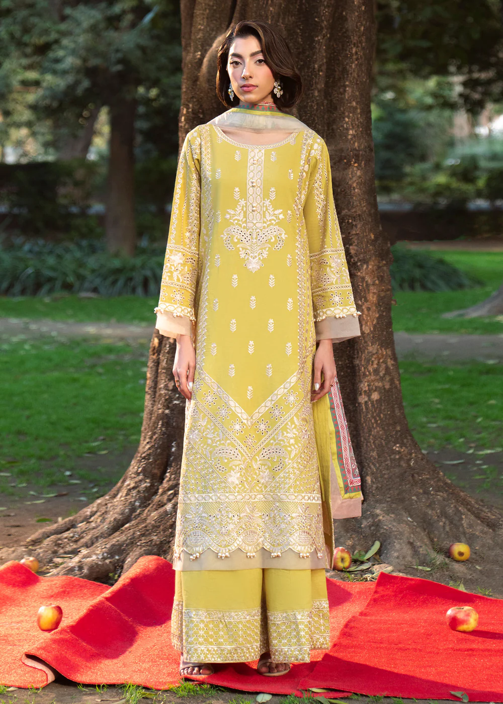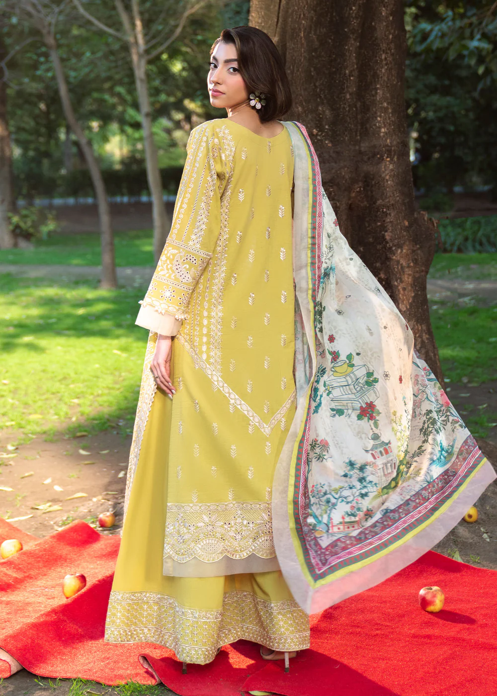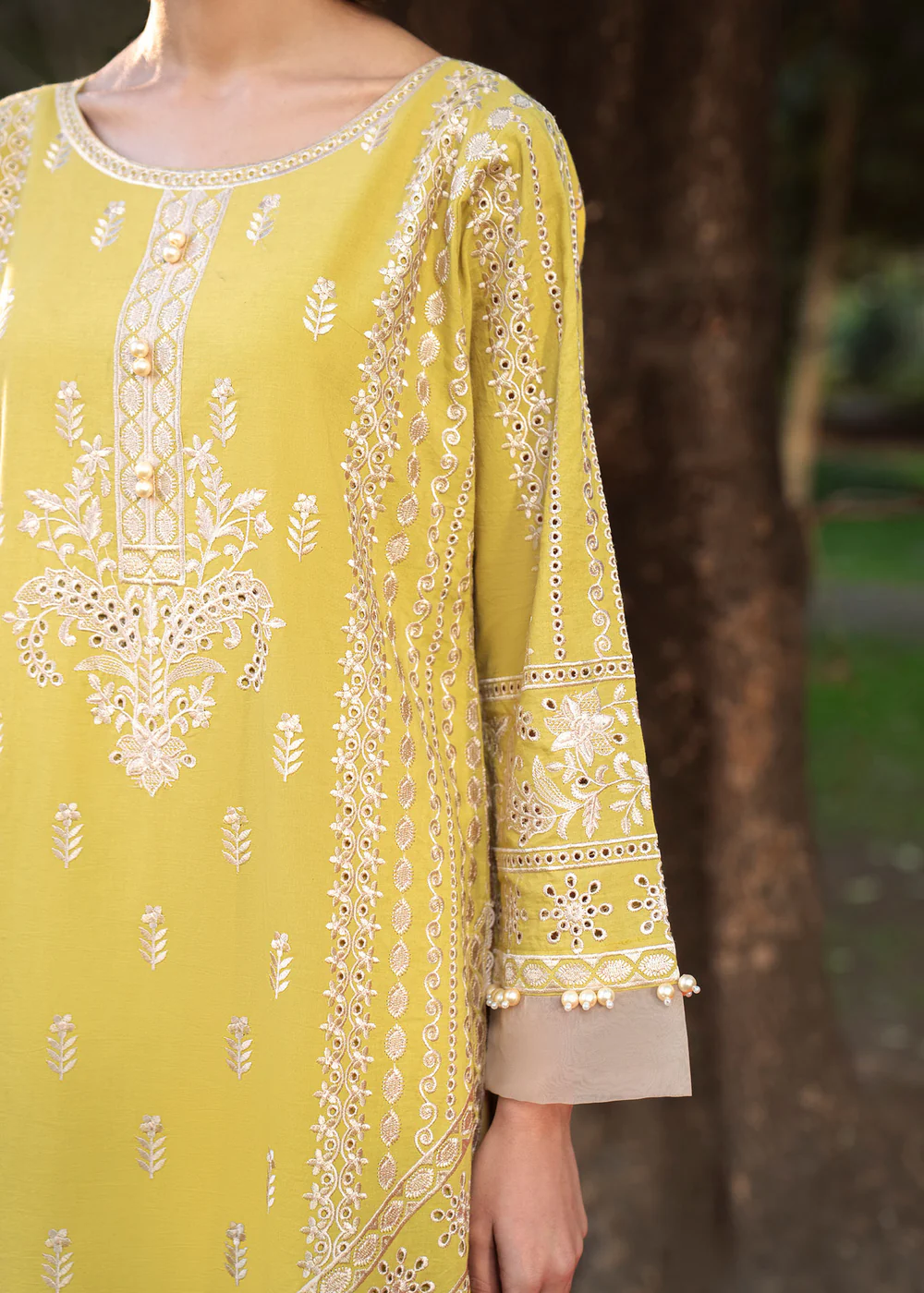 Crafted from premium embroidered lawn, this outfit ensures comfort, breathability, and sophistication—perfect for summer wear. The radiant lime-inspired pale yellow canvas is beautifully enhanced with intricate ivory embroidery and ornate border detailing, creating a soft yet luxurious visual appeal.