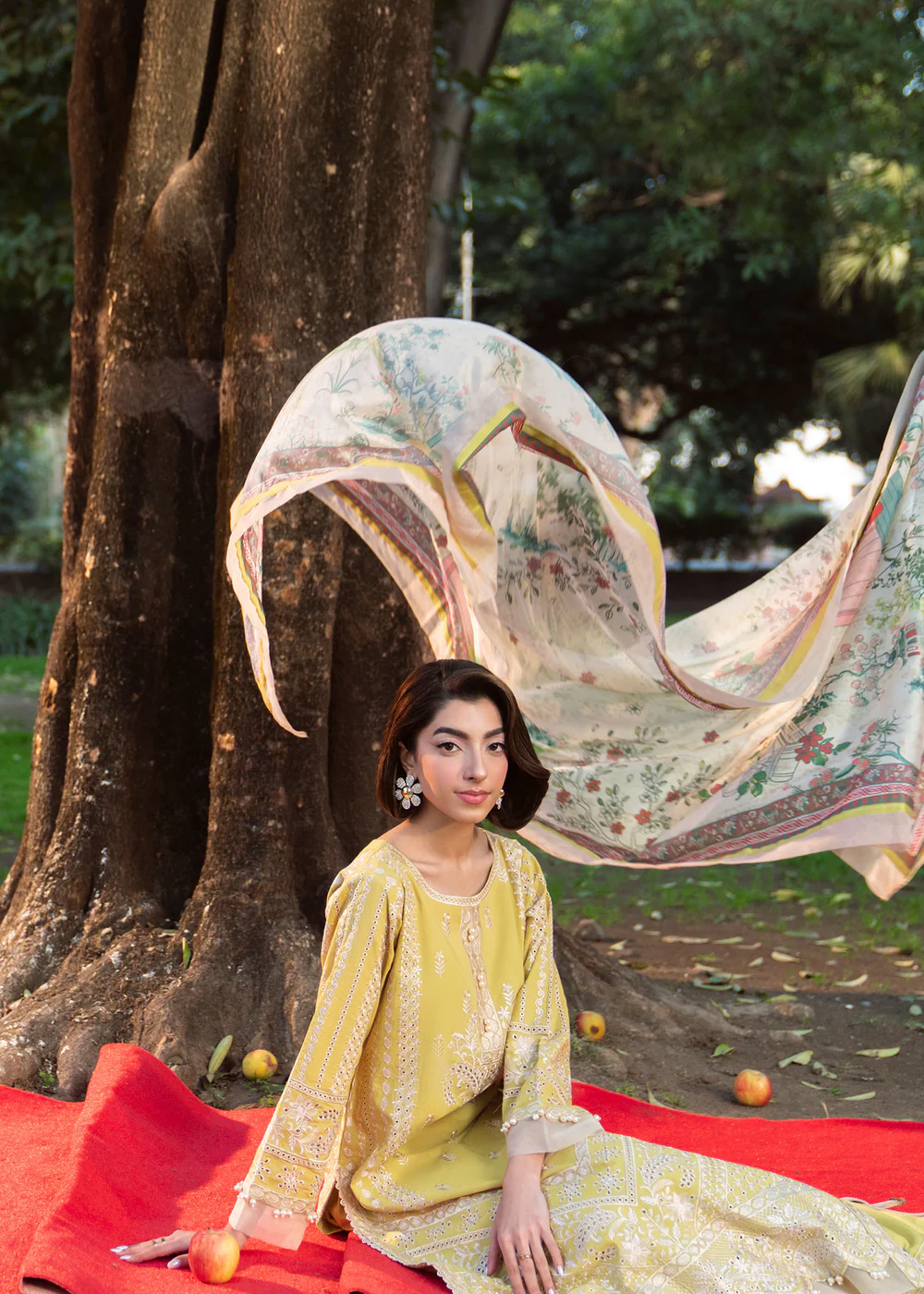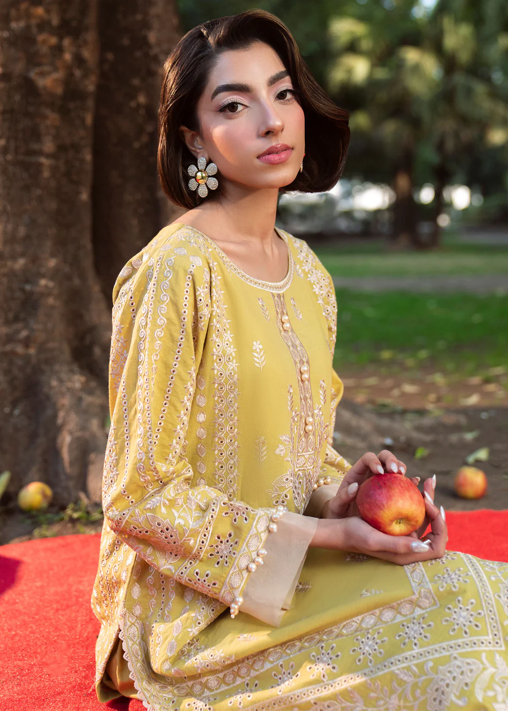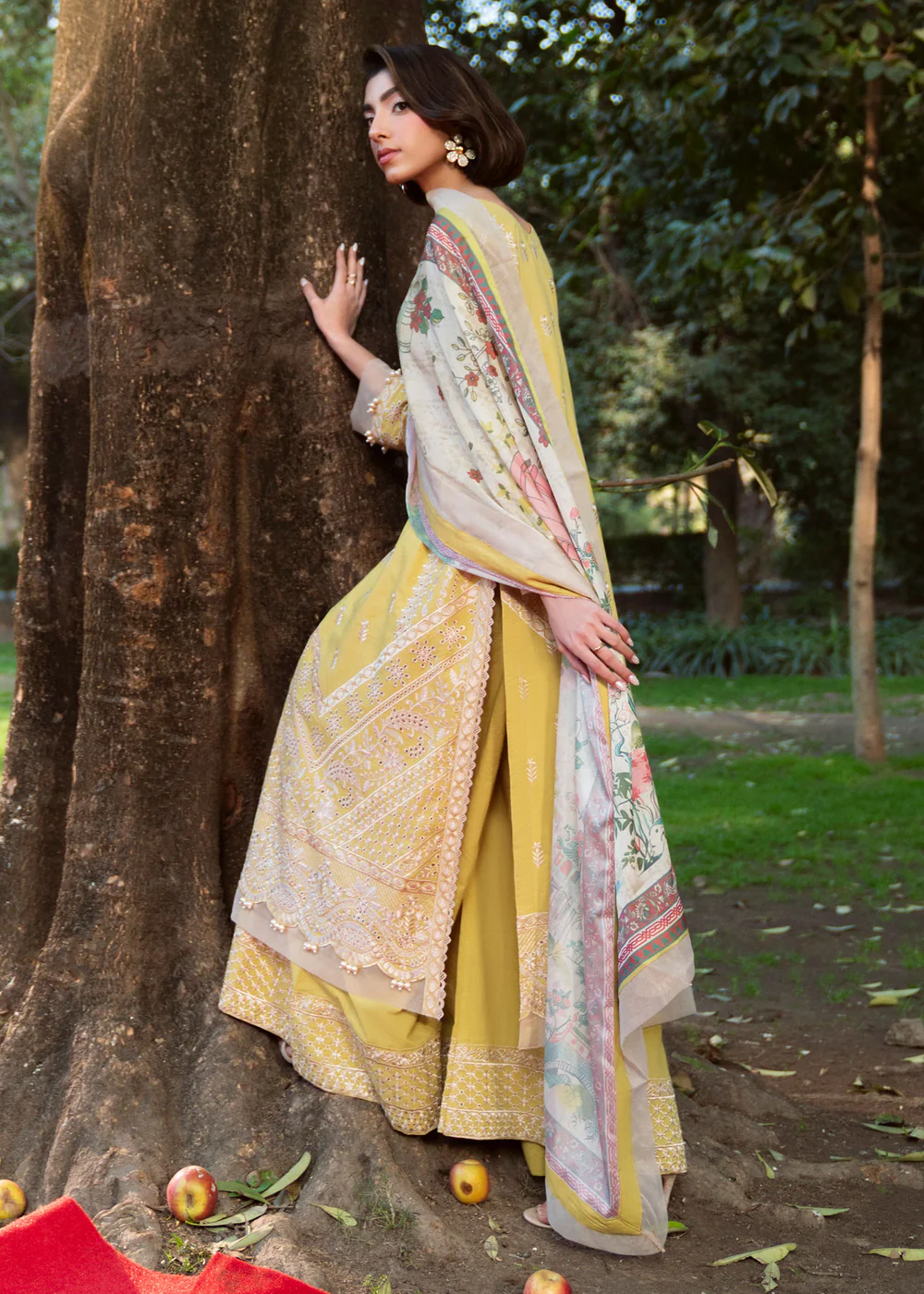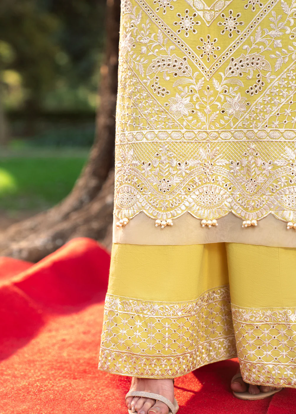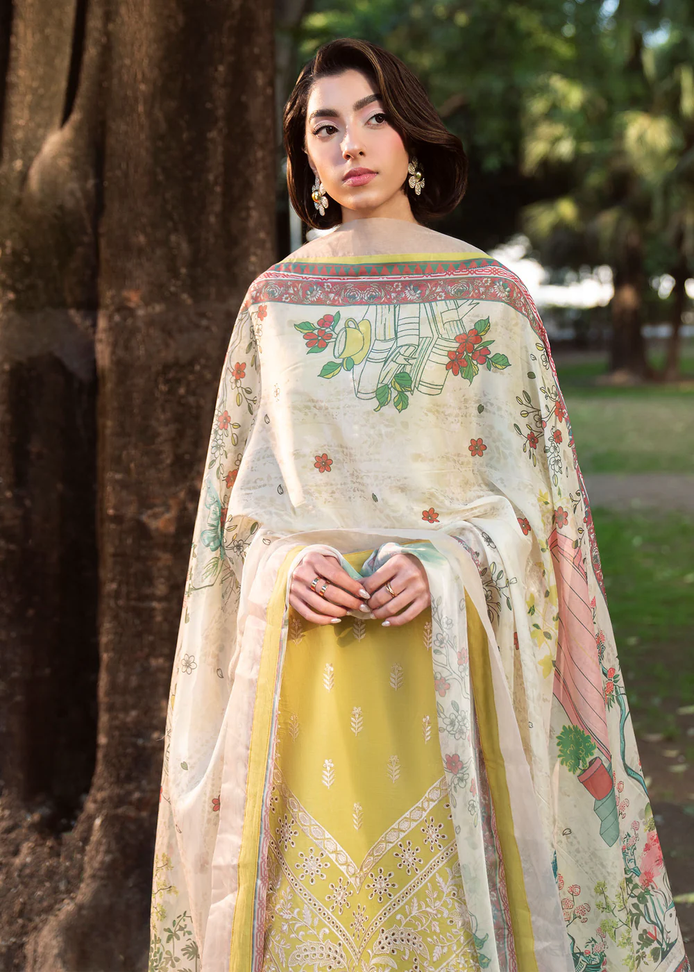 Crafted from premium embroidered lawn, this outfit ensures comfort, breathability, and sophistication—perfect for summer wear. The radiant lime-inspired pale yellow canvas is beautifully enhanced with intricate ivory embroidery and ornate border detailing, creating a soft yet luxurious visual appeal.