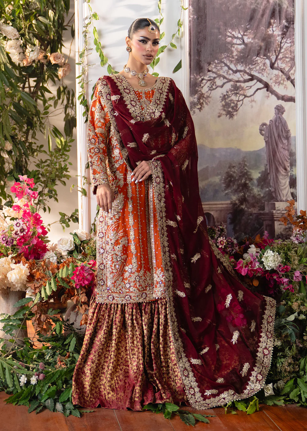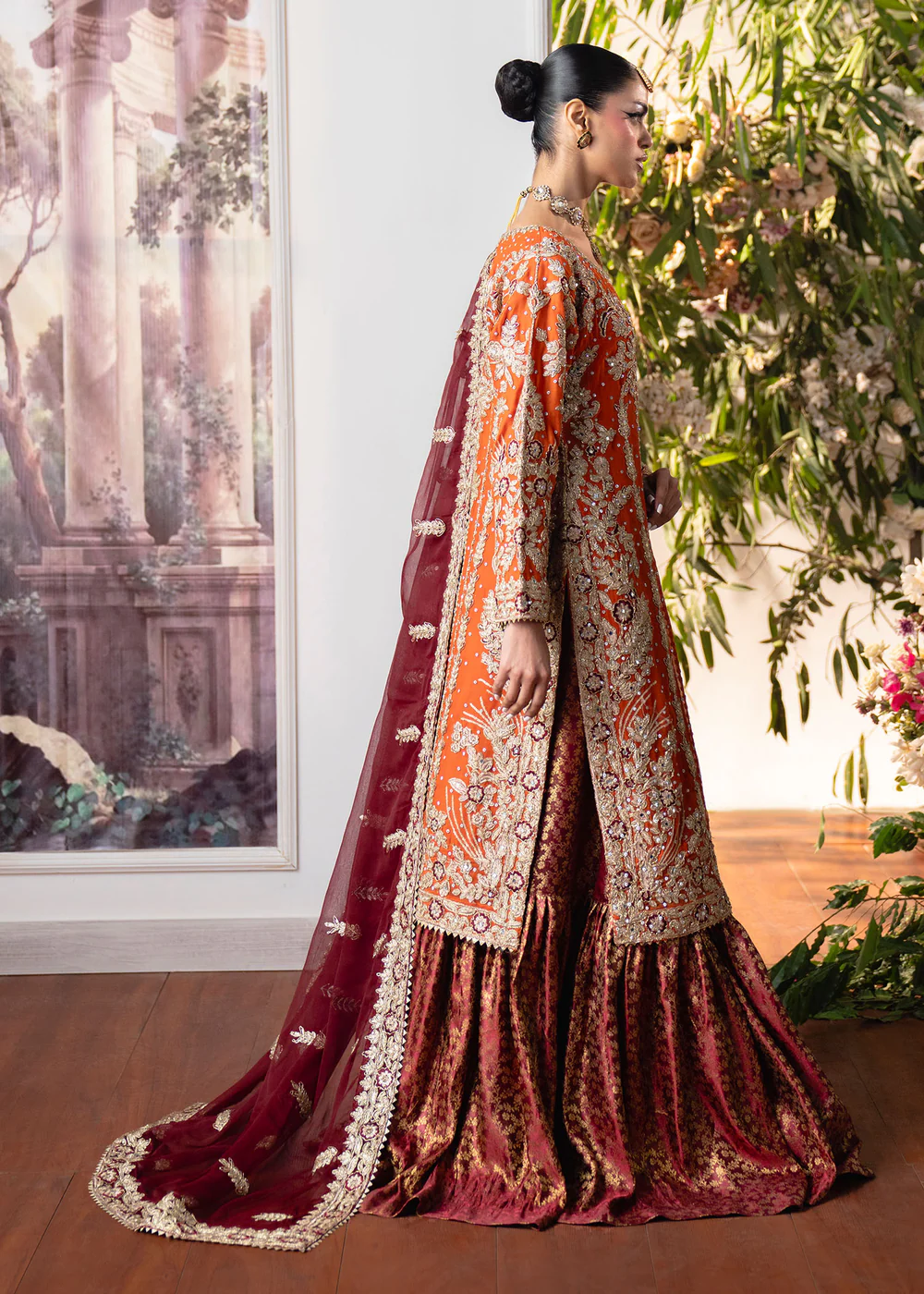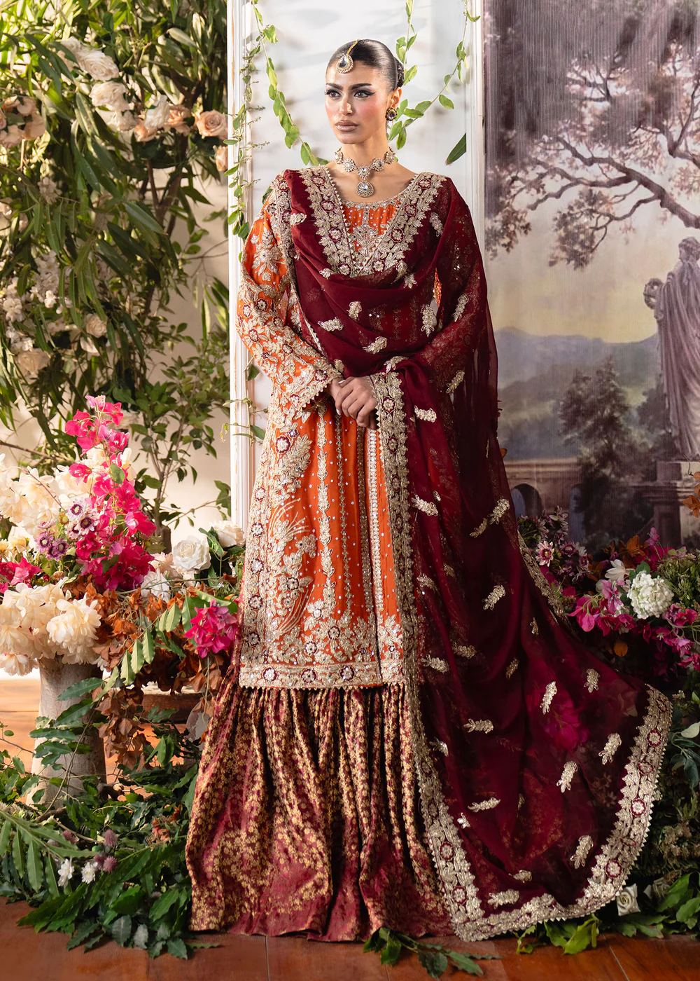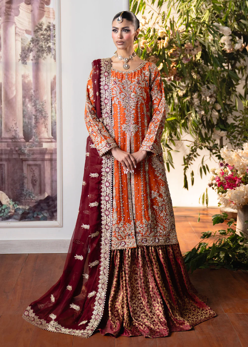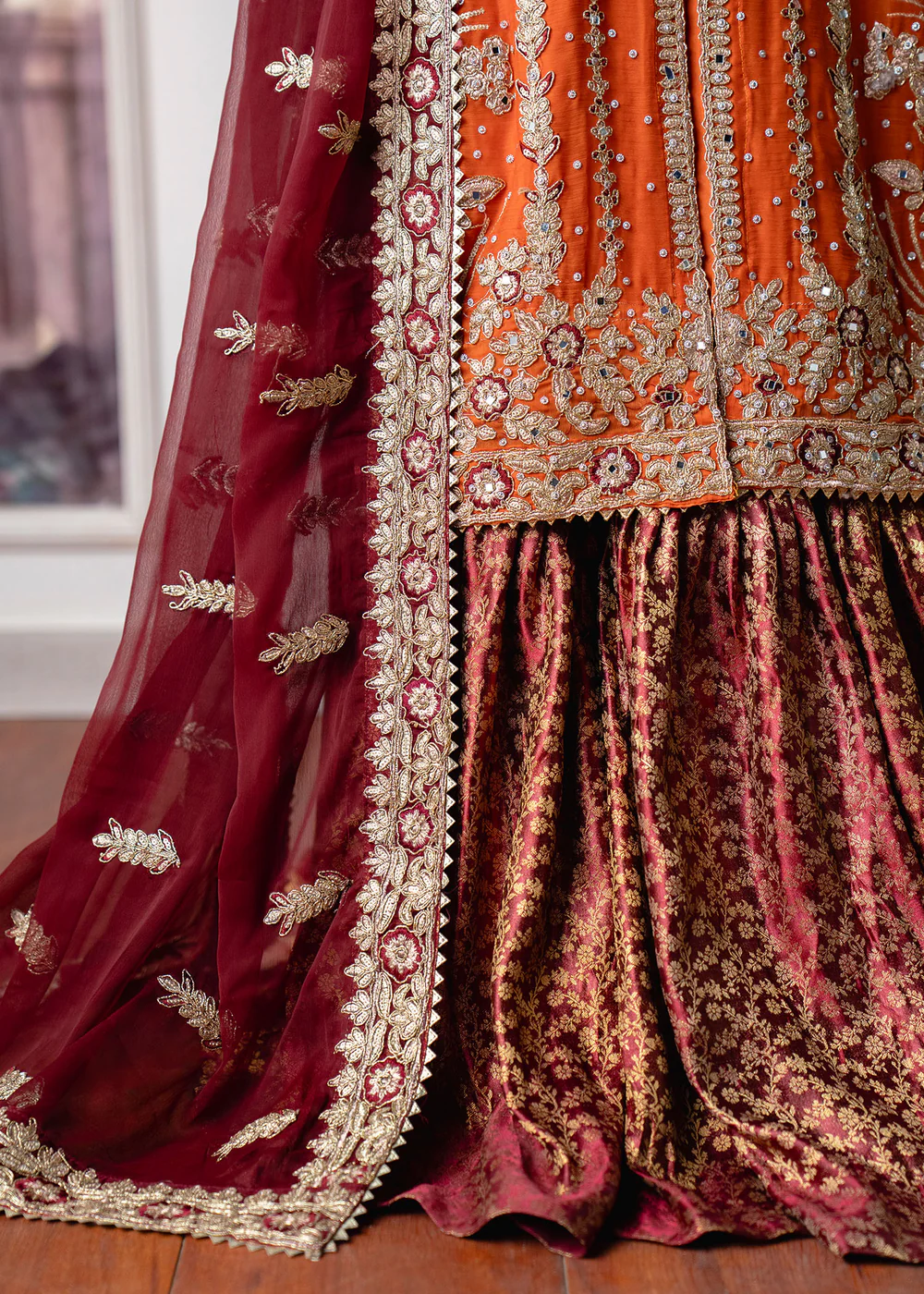 Pumpkin Orange Banarasi Gharara Set for Women – Flared Gharara Kurti with Net Dupatta | Wedding & Formal Guest Wear (3 Piece UIY4968)