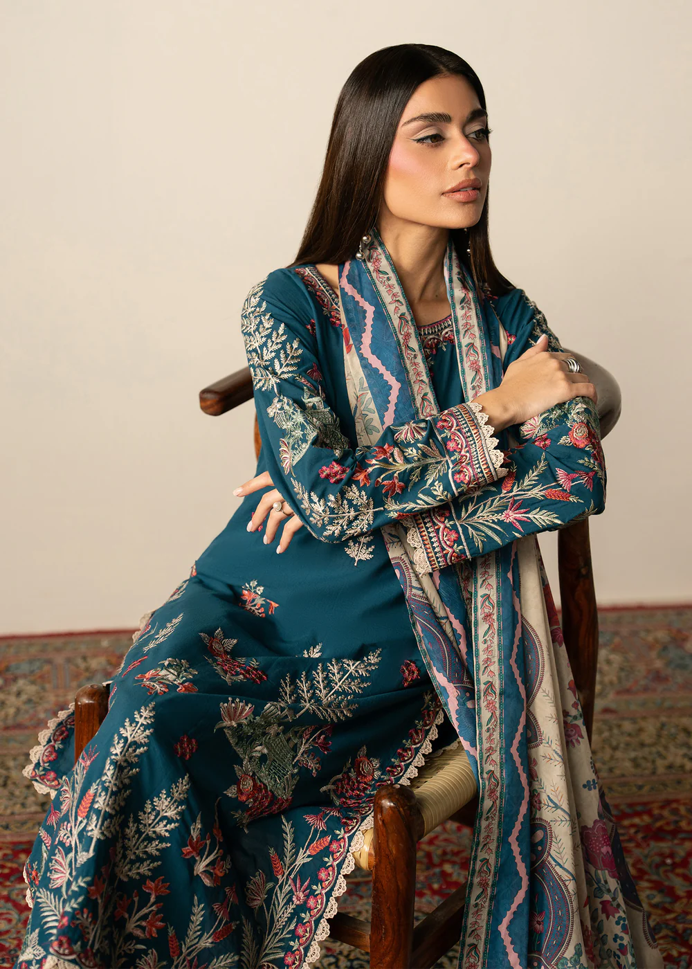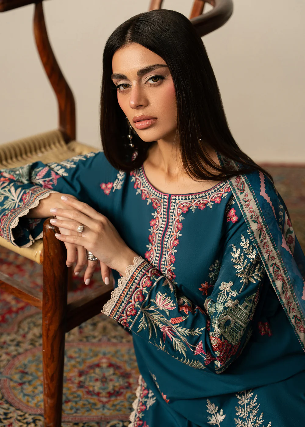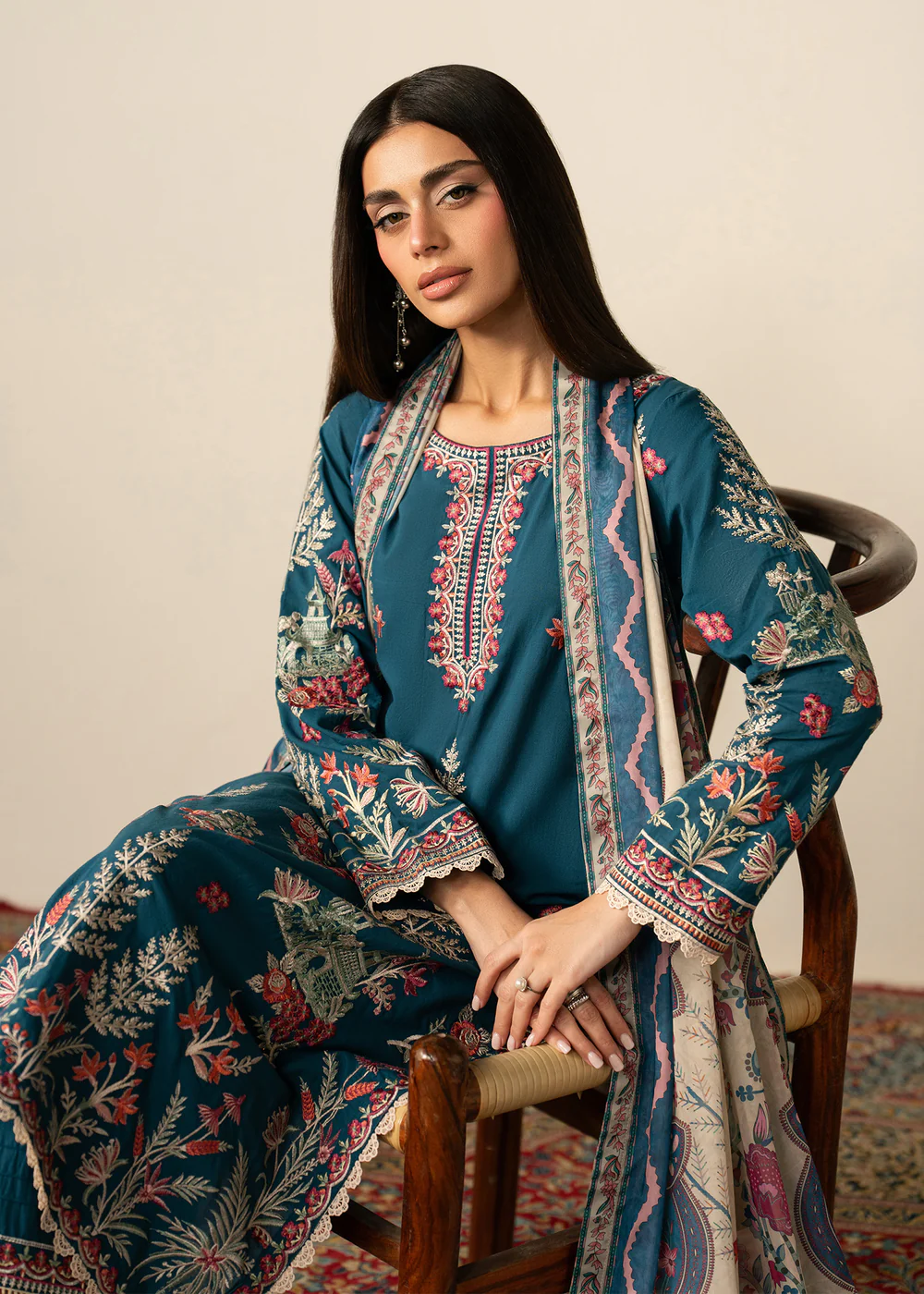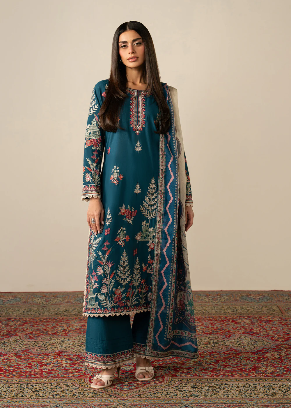 Step into timeless elegance with this beautifully designed teal lawn 3 piece suit, crafted to bring comfort and sophistication together. The outfit features a straight cut kurta made from premium lawn fabric, ensuring breathability and ease throughout the day, especially during warmer seasons.