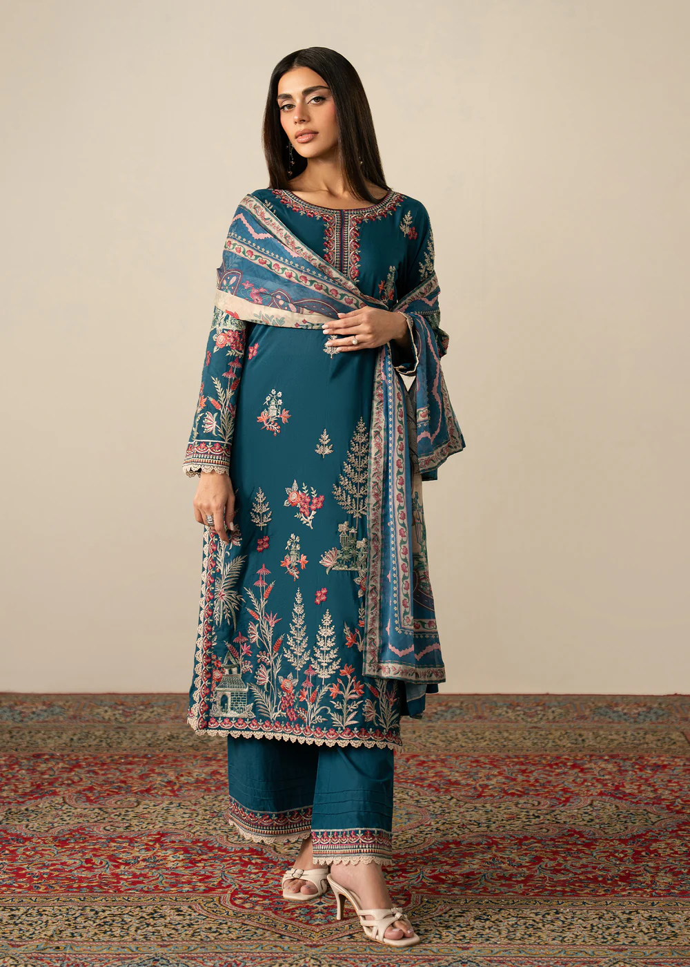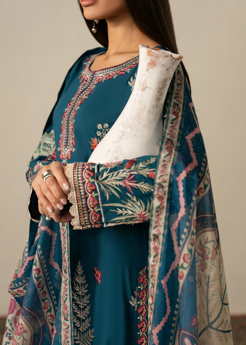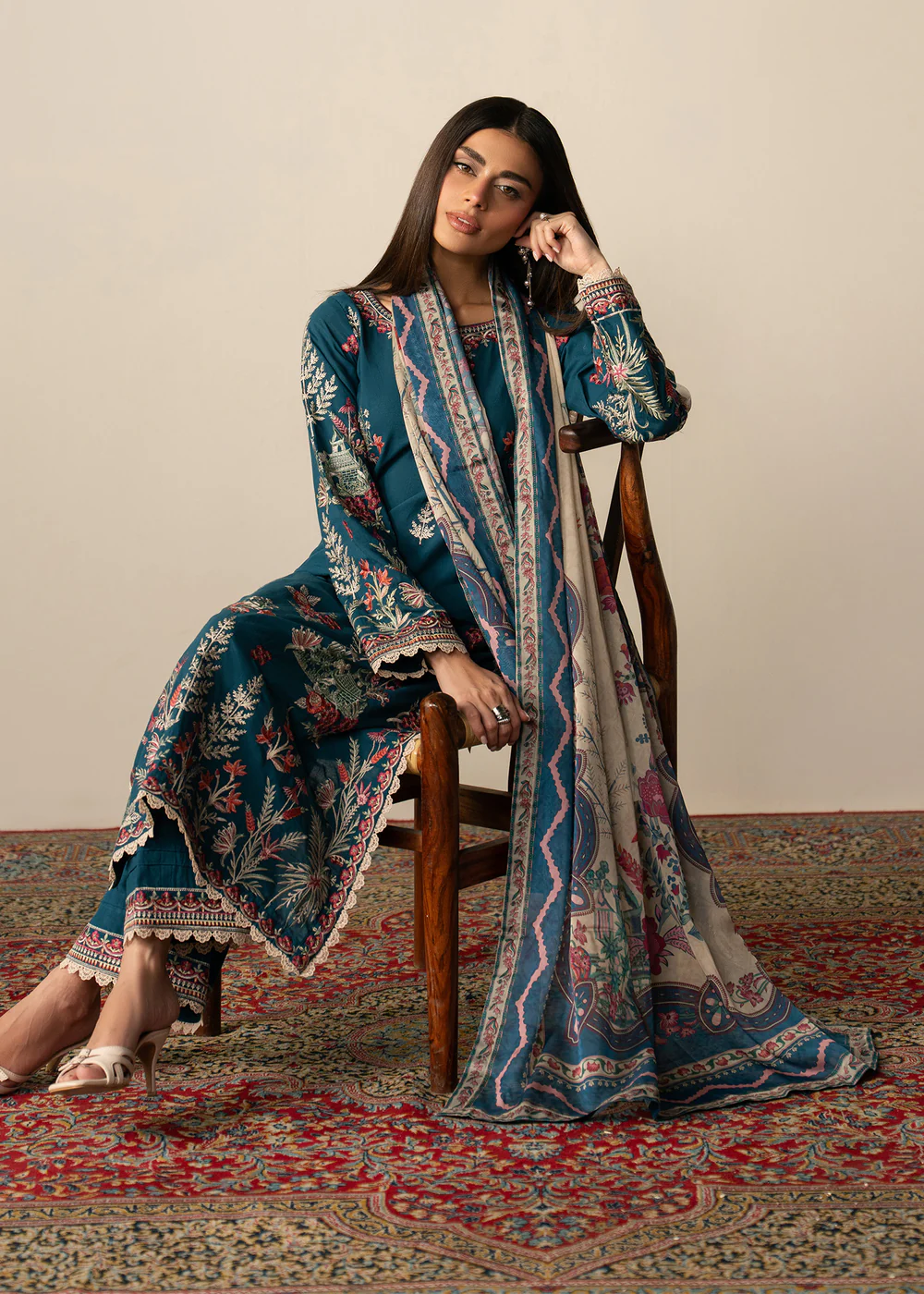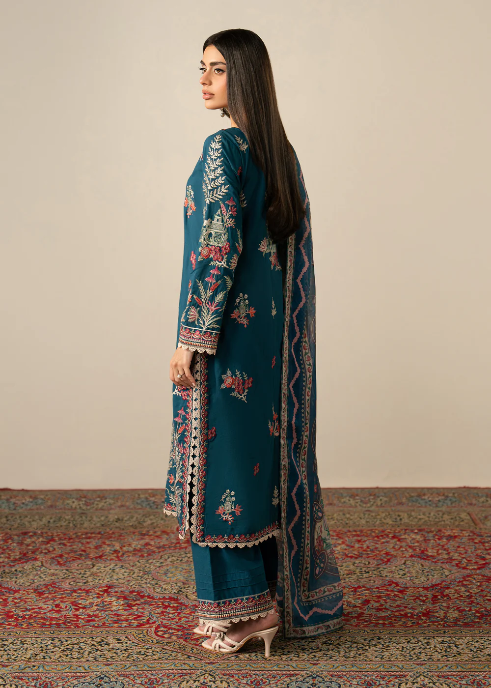 Step into timeless elegance with this beautifully designed teal lawn 3 piece suit, crafted to bring comfort and sophistication together. The outfit features a straight cut kurta made from premium lawn fabric, ensuring breathability and ease throughout the day, especially during warmer seasons.