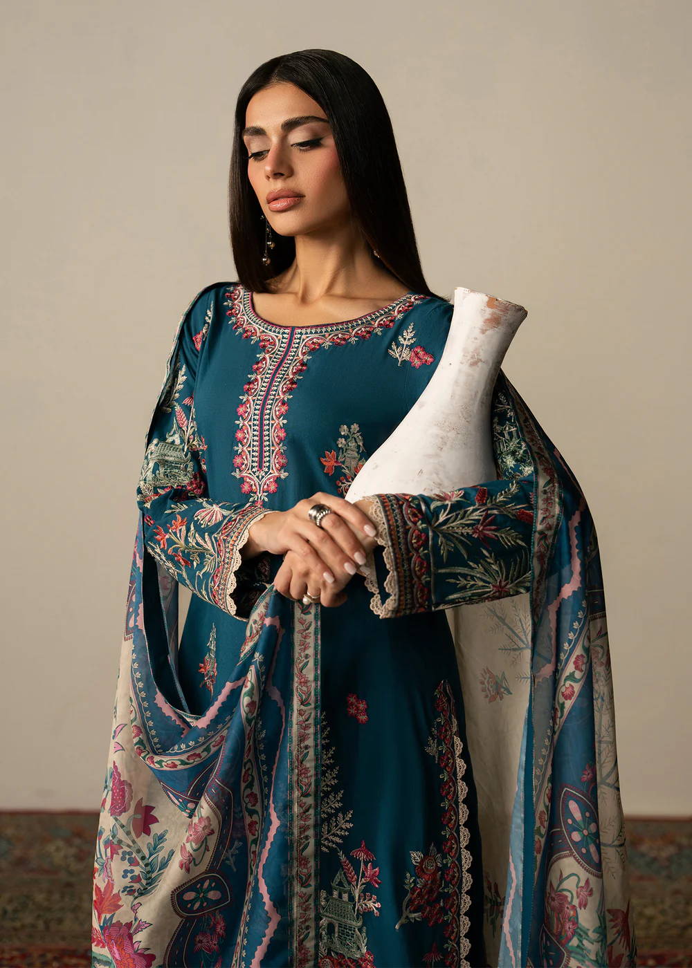 The rich teal color adds a refreshing and luxurious touch, while the kurta is adorned with delicate floral motifs and finely detailed borders that enhance its overall charm. The design strikes the perfect balance between minimalism and festive appeal, making it suitable for both daytime gatherings and evening occasions.